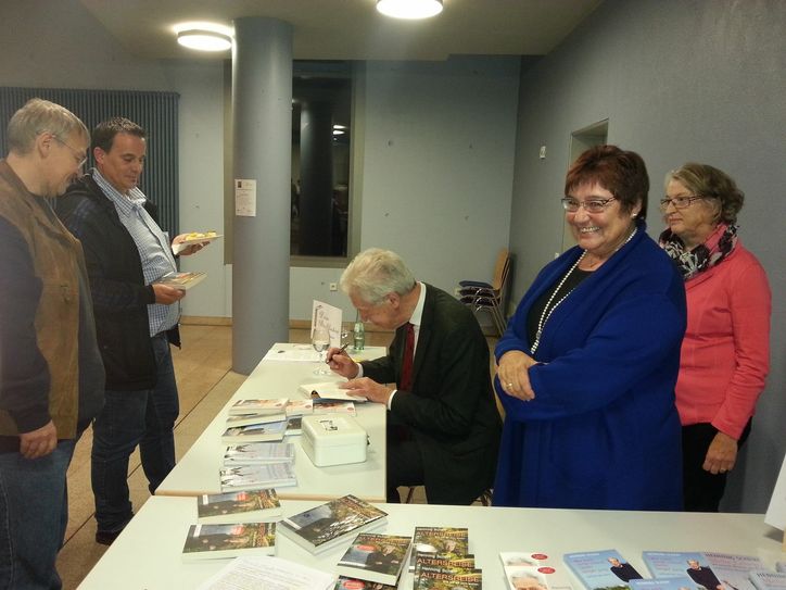 Das Bild zeigt Scherf beim Signieren von Büchern nach seinem lebendigen Vortrag. Foto:privat
