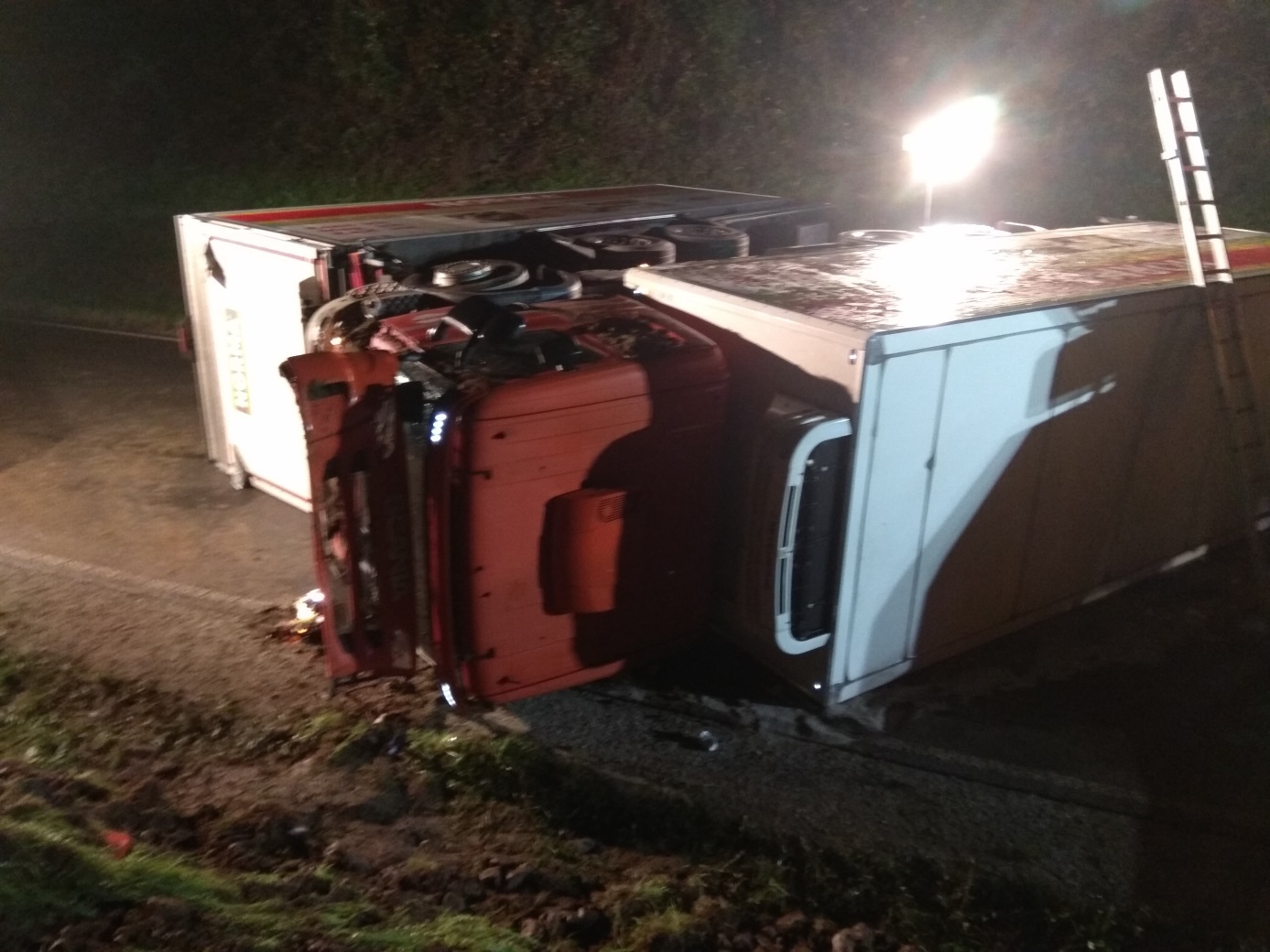 Ein mit Frischware fast vollständig beladener Lastzug baute in der Nacht vom 25. auf den 26. August kurz nach 2 Uhr auf der Umgehungsstraße (L 47) des Bernkastel-Kueser Stadtteils Wehlen einen Unfall. Wie die bisherigen Ermittlungen der Polizei Bernkastel-Kues ergaben, war der Lastzug in Richtung Bernkastel-Kues unterwegs, um einen dort ansässigen Lebensmittelmarkt zu beliefern. Aus noch ungeklärter Ursache kam er auf der Umgehungsstraße in Höhe von Wehlen nach rechts von der Fahrbahn ab und durchfuhr den unbefestigten Straßengraben. Vermutlich versuchte der Fahrer dann durch starkes Gegenlenken das Gespann wieder auf die Straße zurückzufahren. Hierbei geriet der Lastzug dann jedoch ins Schleudern und kippte schließlich um. Zugmaschine und Anhänger legten sich quer auf die Fahrbahn, sodass die Straße komplett blockiert wurde. Die gesamte Unfallstelle zieht sich über einige hundert Meter hin. Auch der Straßenkörper wurde erheblich beschädigt. Der Fahrer blieb unverletzt. Wegen auslaufender Betriebsstoffe wurde die Feuerwehr alarmiert und die Straße über Stunden voll gesperrt. Der entstandene Sachschaden wird auf ca. 250.000 Euro geschätzt. Foto: Polizei