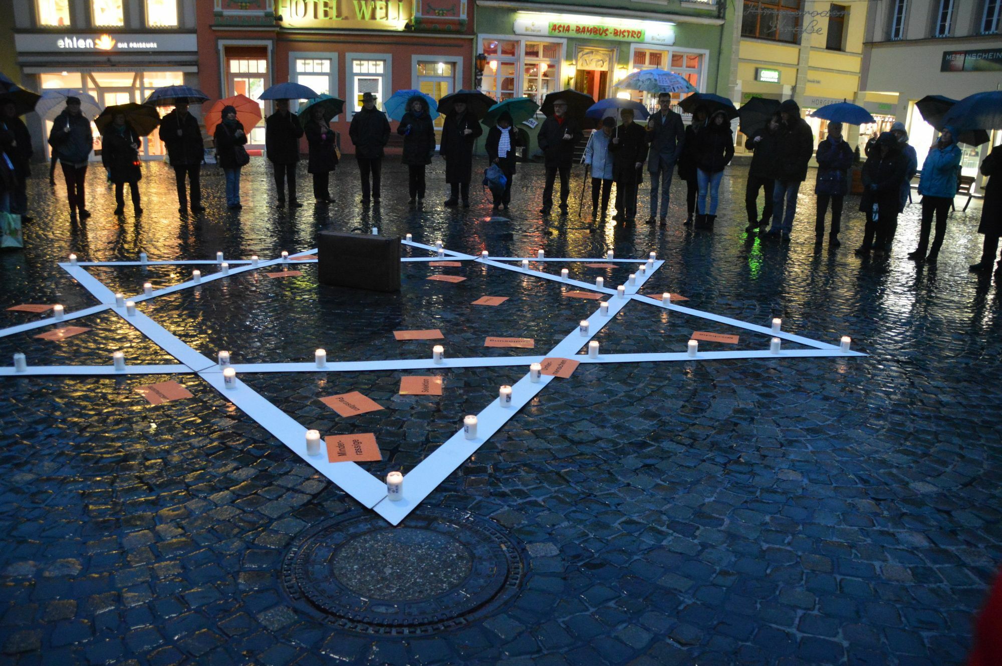 Der Arbeitskreis „Jüdische Gemeinde Wittlich“, das Emil-Frank-Institut und das Kulturamt der Stadt Wittlich hatten die Bevölkerung um Teilnahme an der Mahnwache auf dem Marktplatz gebeten. Eine jüdische Französin aus Brunoy betete das Kaddisch öffentlich.