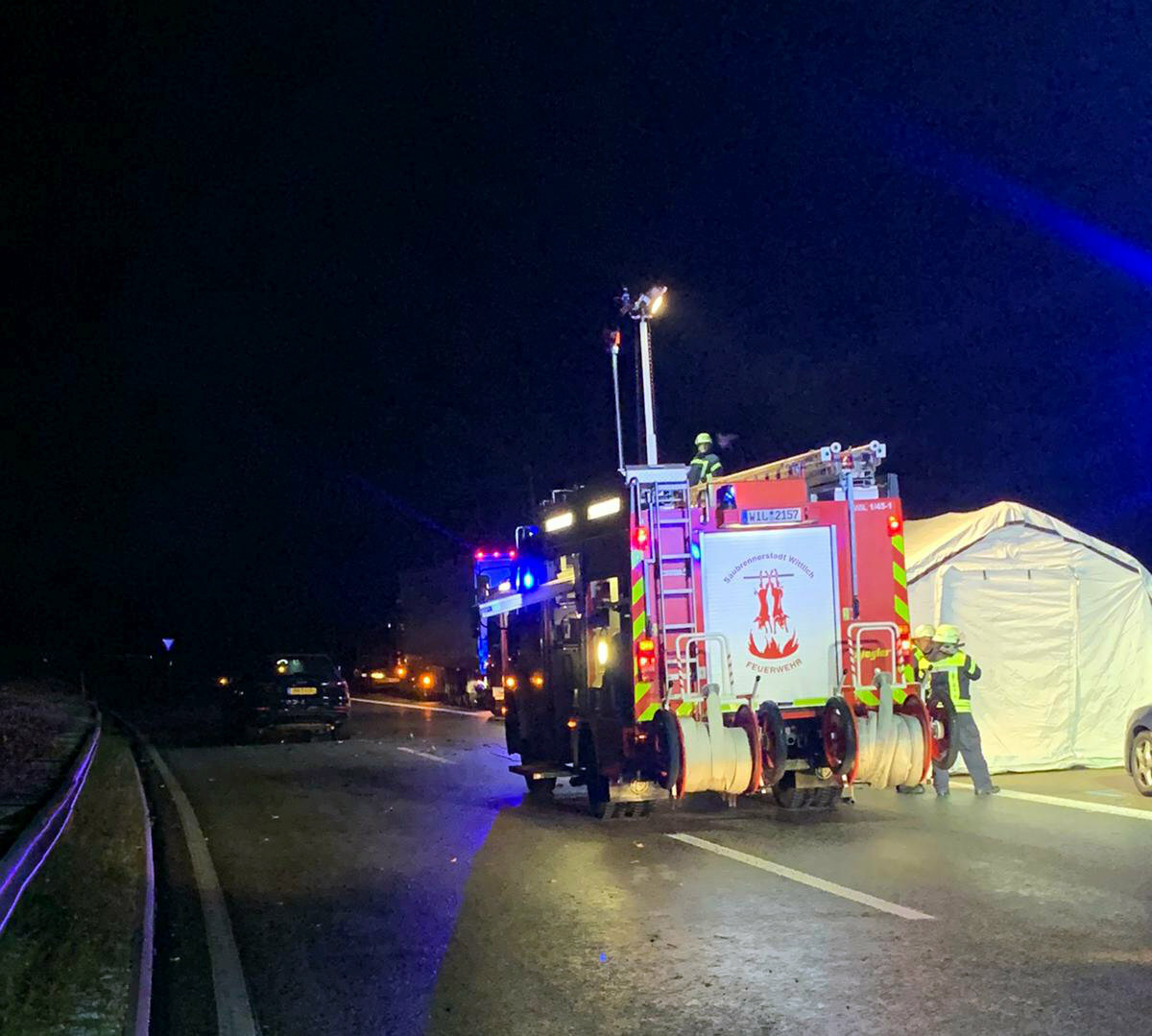 Im Rahmen der Ableitung des nachfolgenden Verkehrs ereignete sich ein Folgeunfall zwischen zwei weiteren PKW. Während der Unfallaufnahme und Bergungsmaßnahmen war die Autobahn für vier Stunden voll gesperrt. Nach derzeitigem Ermittlungsstand wurden vier Personen leicht verletzt und zur weiteren Abklärung in umliegende Krankenhäuser verbracht. Der vorläufige Sachschaden wird momentan auf ca. 200.000 Euro geschätzt. Im Einsatz befanden sich Einsatzkräfte der Freiwilligen Feuerwehren Wittlich-Land, Laufeld und Manderscheid, des Katastrophenschutzes des Landkreises Bernkastel-Wittlich, mehrere Rettungswagen und ein Notarzt, die Autobahnmeisterei Wittlich sowie Polizeikräfte der PI Wittlich, der PI Daun und der Autobahnpolizei Schweich. Insgesamt befanden sich über 100 Einsatzkräfte vor Ort. Fotos: Steil TV