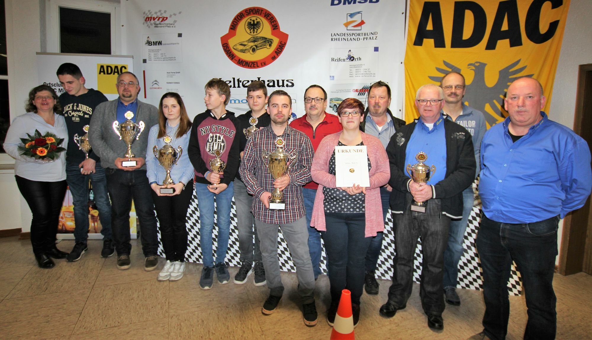 In seinen Dank schloss er alle Helferinnen, Helfer und Sportkameraden ein. Auch dankte er den Sportwarten, die wieder bei vielen Großveranstaltungen, wie dem ADAC Truck Grand Prix auf dem Nürburgring im Einsatz waren. Manfred Bläsius moderierte die Ehrungen, untermalt mit Bildern und Videoeinspielungen des abgelaufenen Sportjahres. Die Pokale, Medaillen und Urkunden wurden von den Ehrenvorsitzenden Hermann-Josef Ternes und vom 1. Vorsitzenden Ottmar Sailler überreicht. Meister im Kartslalom der Altersklasse P4 wurde Eric Sowart vor Elias Erz. Im Touristiksport konnte wieder einmal mehr Ottmar Sailler die Meisterschaft gewinnen. Michelle Bläsius wurde mit einem Pokal, für ihre tolle Saison und als beste Dame des Vereins geehrt. An der Automobilslalomwertung nahmen 7 Fahrer teil. Ralf Orth wiederholte seinen Meistertitel vom Vorjahr, gefolgt von Tim Kleinsorg und Manfred Bläsius. Die Plätze 4 bis 7 belegten Tony Tute, Michelle Bläsius, Ralf Kleinsorg und Patrick Orth. Dagegen konnte Patrick Orth den Vereinsmeistertitel im Bergrennsport vor seinem Vater Ralf und Ralf Kleinsorg erreichen. Die weiteren Plätze belegten Tim Kleinsorg, Manfred und Michelle Bläsius. Mit der Ewald-Kroth Medaille, die vom ADAC für besondere Verdienste in der Motorsportorganisation verliehen wird, konnten Sabrina Heindrichs mit Bronze und Paul Altevers mit Silber geehrt werden. Als krönenden Abschluss der Ehrungen wurden langjährige Mitglieder mit der Ehrennadel des MSV Osann-Monzel ausgezeichnet. Für ihre zehnjährige Vereinsmitgliedschaft wurden Heidi Elzer, Rainer Kilburg, Christoph Bauer, Michael Sell, Christian Paulus und Mario Reh und für 25 Jahre konnte Rainer Mathy und Winfried Nicolay geehrt werden. RED