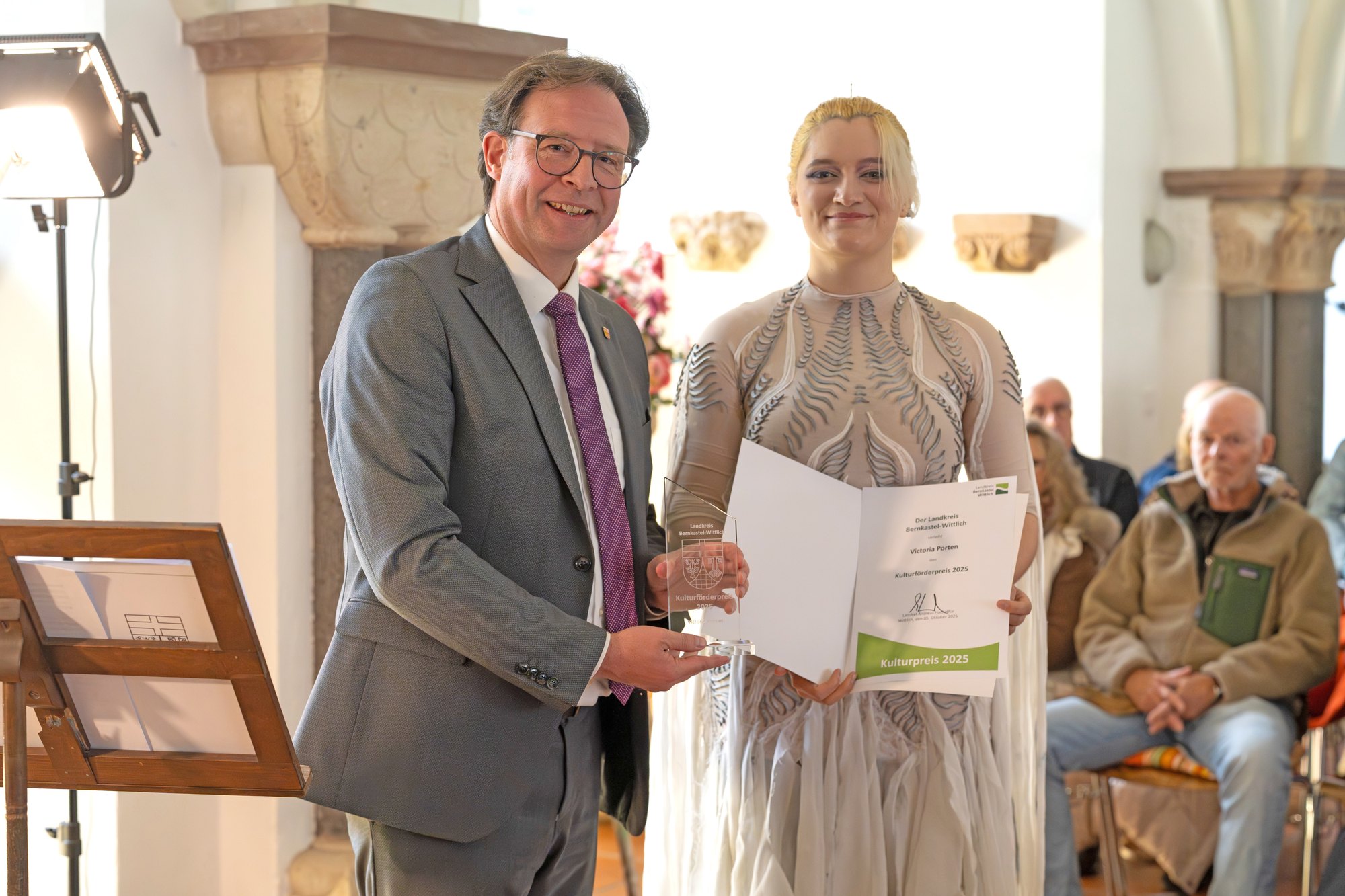 Der Kulturförderpreis 2025 mit 2.000 Euro ging an Victoria Porten aus Salmtal. Die 23-jährige Künstlerin beeindruckte die Jury durch ihre Vielseitigkeit und künstlerische Reife. Schon mit 14 Jahren gewann sie den Alexandra-Lang-Jugendkunstpreis und stellte im Landesmuseum Mainz aus. Heute studiert sie Freie Kunst an der Kunsthochschule Mainz und beschäftigt sich intensiv mit Comics und Manga. Ihre Arbeiten wurden auf der Plattform Webtoon veröffentlicht, in Ausstellungen in Rheinland-Pfalz und zuletzt im Mai 2025 im Palais Carli in Marseille gezeigt. Mit ihrer im September erschienenen Graphic Novel „Der Nazi an Mamas Frühstückstisch“ widmet sie sich gesellschaftlich relevanten Themen in eindrucksvoller künstlerischer Sprache. Während der Preisverleihung stellte Porten ihr Werk selbst vor und erläuterte den Gästen ihre künstlerischen Ansätze und Motive.