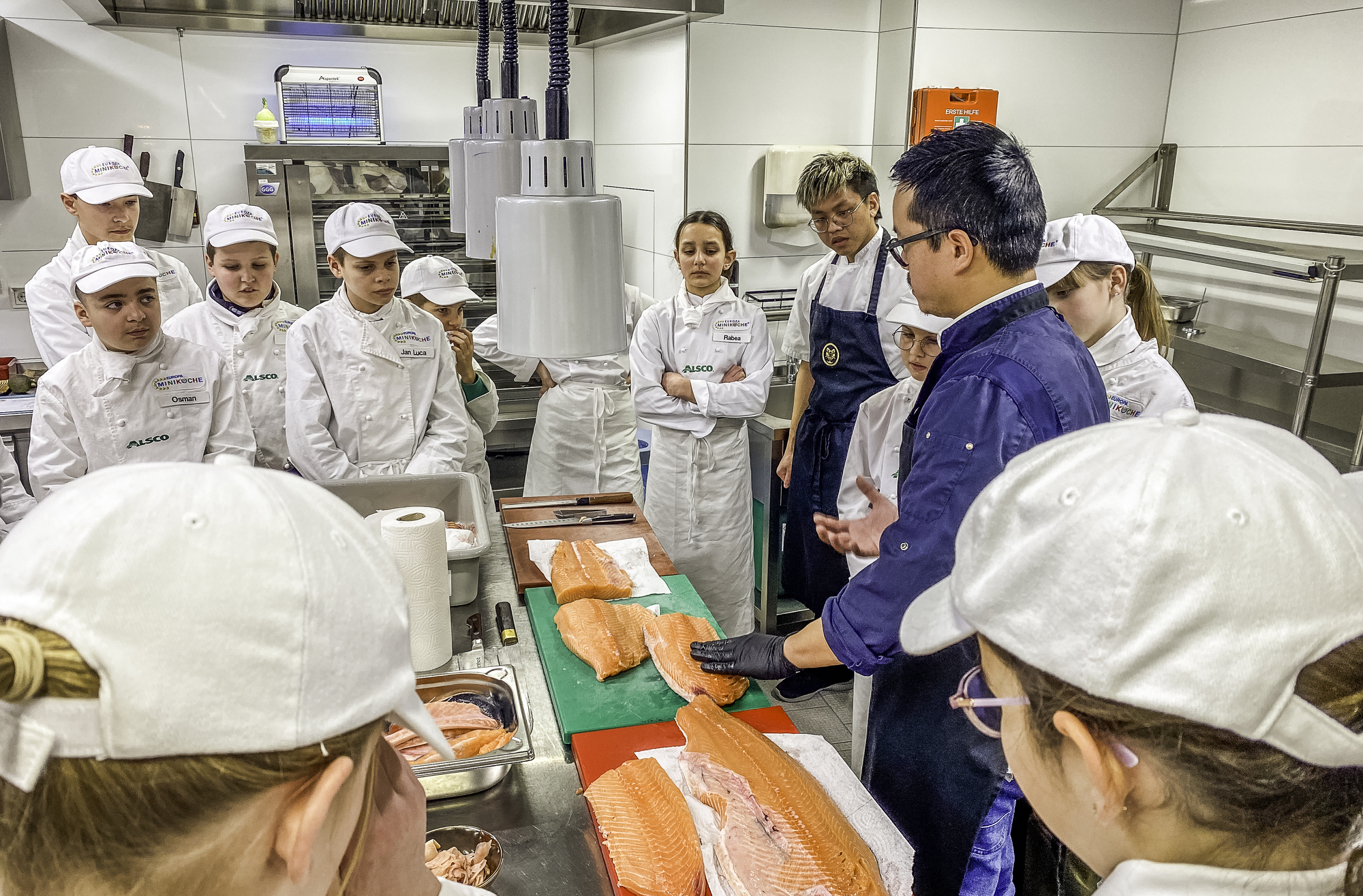 Das jüngste Treffen im Restaurant Dian im Hotel Deinhard´s in Bernkastel-Kues stand unter dem Thema Fisch und die Kinder lernten, wie Sushi zubereitet wird. Unter der fachkundigen Anleitung von Restaurantleiter Hoang Dinh Phuong wurde ein frischer Lachs filetiert, um ihn später in die Sushi-Maki-Rollen einzuarbeiten. Die Kinder erlernten dabei besondere Handgriffe, um die Gräten aus dem Fisch präzise zu entfernen.