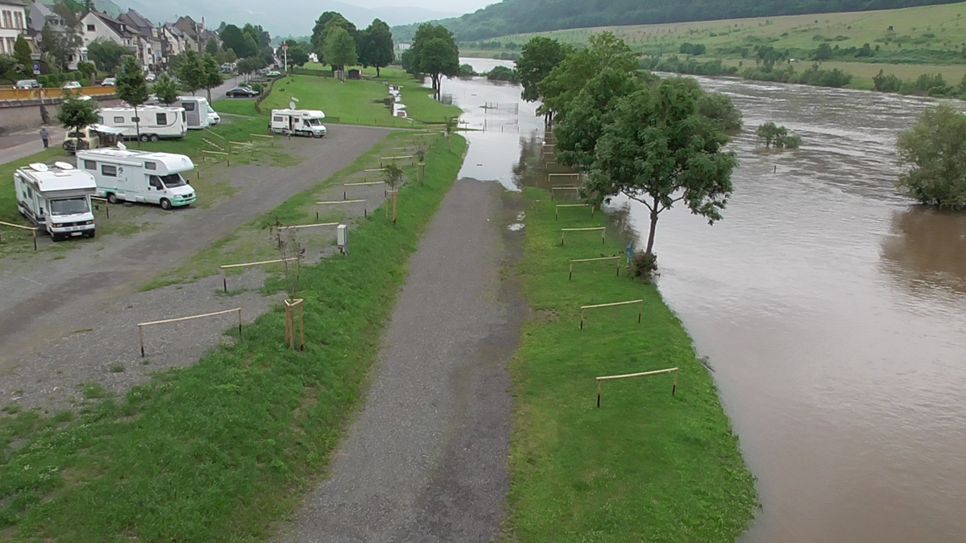 Durch den vielen Regen der vergangenen Tage in den Einzugsgebieten der Mosel, Saar und Ruwer führt diese aktuell Hochwasser. Flussauf- und -abwärts wurden sämtliche Campingplätze geräumt. Viele Camper sind abgereist oder bezogen ihr Domizil auf höher gelegenen Stellplätzen. Fahrradwege und ufernahe Parks sind bereits überflutet, ebenso Parkplätze. Die ersten Straßen in der Region wurden wegen Hochwasser gesperrt. So unter anderem die Bundesstraße 53 Cochem - Trier: Sie ist zwischen Kinheim und Zeltingen in beiden Richtungen gesperrt. Ebenso die Kreisstraße 134 zwischen Lieser und Kesten. Das „internationale Motorbootrennen“ auf der Mosel bei Traben- Trabach wurde wegen der Wetterlage und des derzeitigen Hochwassers abgesagt. Der Höchstand der Mosel in Trier lag laut Hochwassermeldezentrum gestern Abend bei 6,66 Meter. Seither ist sie fallend. Von Entwarnung kann aber nicht gesprochen werden. Der Deutsche Wetterdienst (DWD) warnt wiederholt vor schweren Gewittern und starken Regenfällen. Somit wäre ein erneuter Anstieg der Mosel wahrscheinlich. Unsere Aufnahmen zeigen die Mosel bei Ürzig und Zeltingen- Rachtig. Dort sind die Uferbereiche überschwemmt. Die Campingplätze. Fotos: Agentur Siko