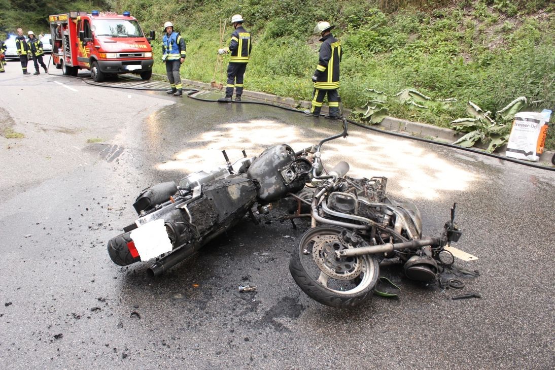 Fast zwei Stunden war die B 50 zwischen Bernkastel und Longkamp am Nachmittag des 5. Septembers wegen eines Motorradunfalls voll gesperrt. Drei Motorradfahrer befuhren die kurvenreiche Strecke in Richtung Hunsrück. Während der erste Biker noch durch die langgezogene Linkskurve kam, stürzte der nachfolgende, ein 20-Jähriger aus dem Kreisgebiet, prallte gegen die Schutzplanke und wurde auf die Straße zurück geschleudert. Der letzte Fahrer der Gruppe, ein 42-jähriger Mann, konnte nicht mehr ausweichen und prallte in das gestürzte Motorrad. Dabei wurden beide Tanks der Motorräder aufgerissen; der Kraftstoff entzündet sich augenblicklich. Die zwei Kräder brannten vollständig aus. Beide Motorradfahrer wurden verletzt; der Auffahrende wurde zur weiteren Behandlung ins Krankenhaus abtransportiert. Der Sachschaden wird auf ca. 15.000 € geschätzt. Unfallursächlich dürfte eine nicht angepasste Fahrgeschwindigkeit bzw. Fahrfehler durch mangelnde Fahrerfahrung sein. Die Straßenmeisterei war zur Straßenreinigung ebenfalls vor Ort. Für die Dauer der Sperrung wurde der Verkehr über Monzelfeld umgeleitet. Foto: Polizei