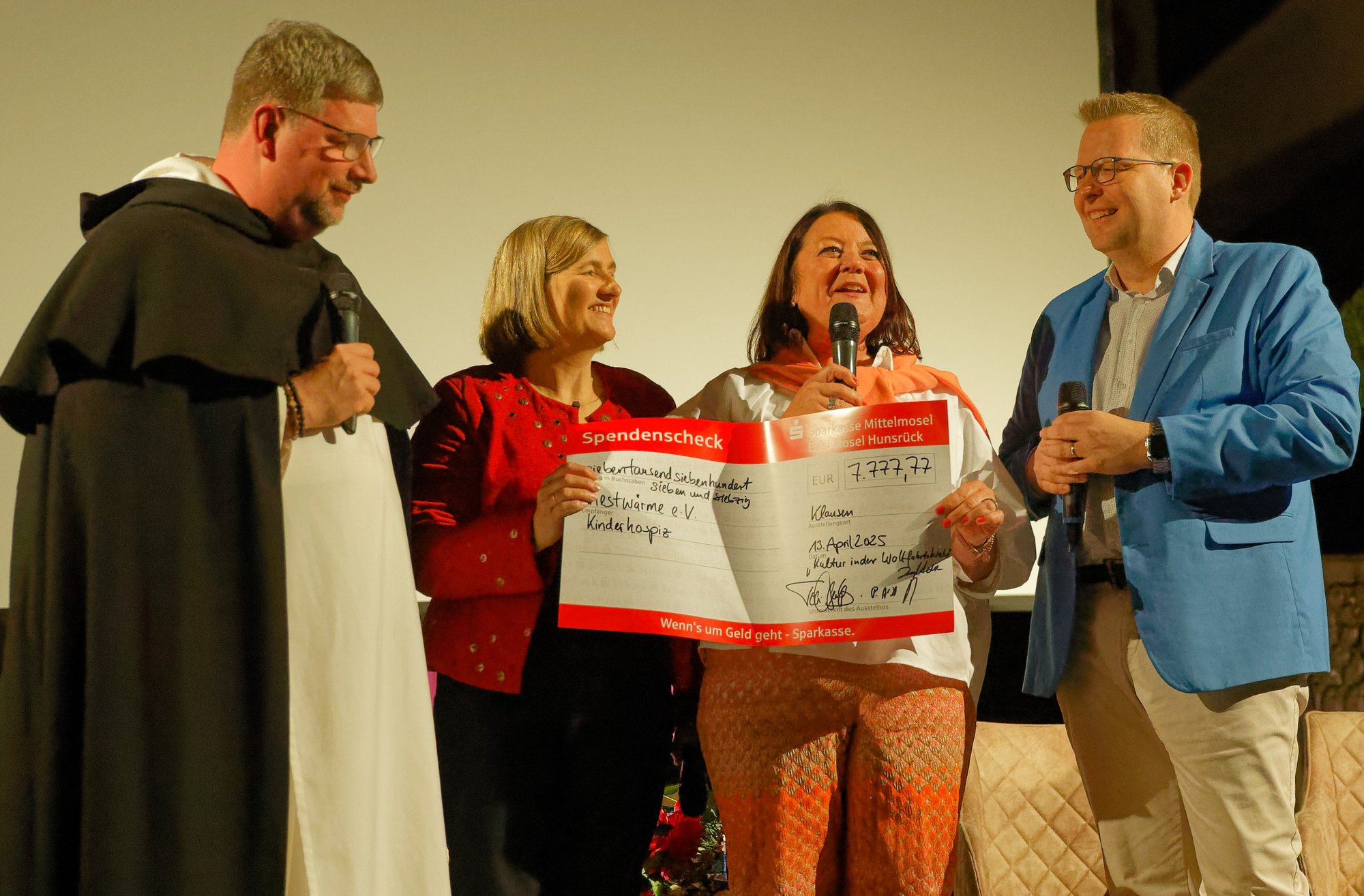 Durch den Erlös der Benefizveranstaltung und u.a. durch Spenden aus Getränken bei Veranstaltungen von “Kultur in der Wallfahrtskirche” konnte ein Scheck über 7.777,77 Euro für den Bau des Kinderhospiz Trier überreicht werden.
