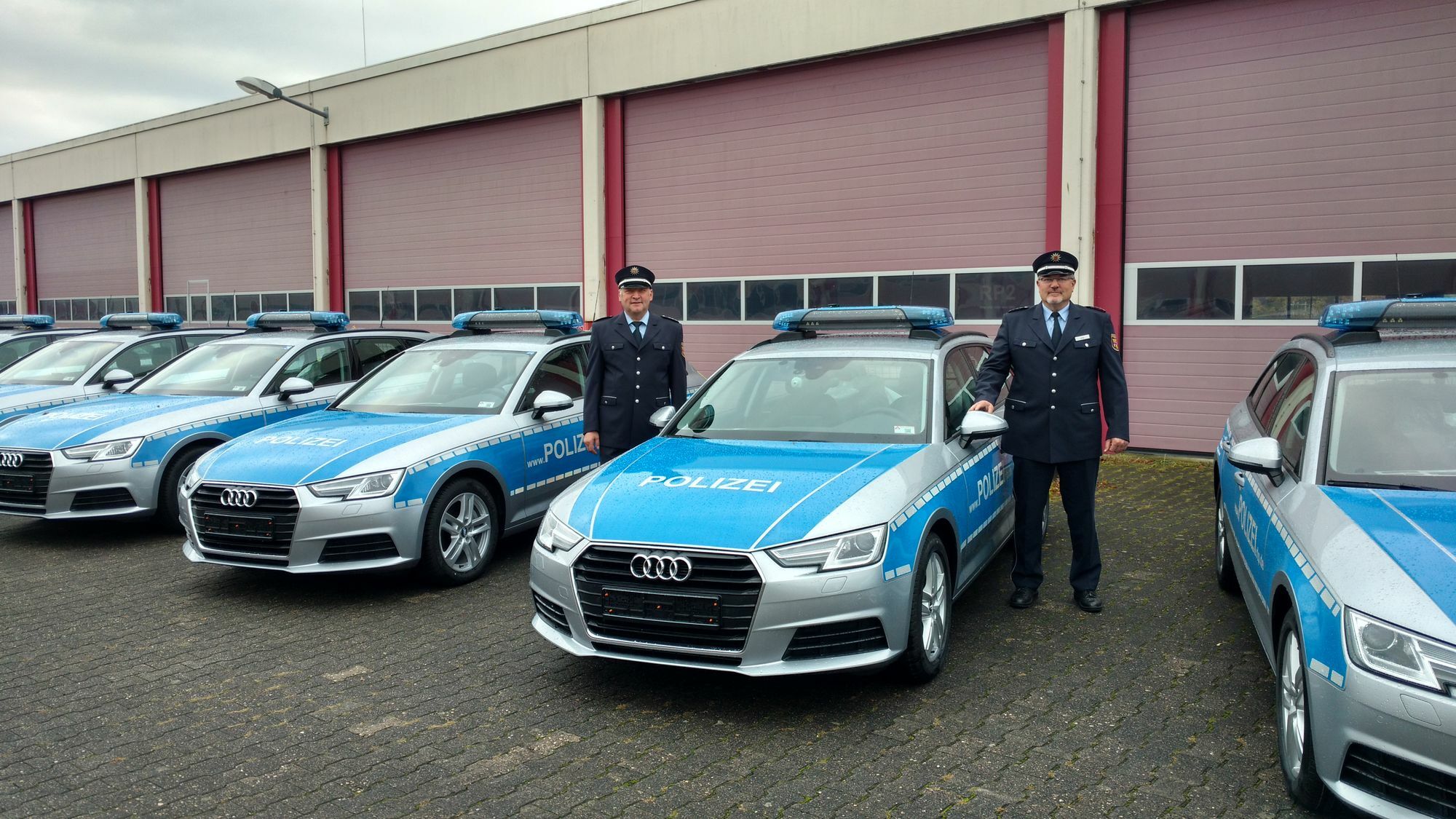 Sieben der von Innenminister Roger Lewentz gestern in Mainz vorgestellten neuen Funkstreifenwagen der Marke Audi A4 werden schon bald im Zuständigkeitsbereich des Polizeipräsidiums Trier unterwegs sein. Das Land beschafft die Fahrzeuge, die auf neustem technischen Stand den Erfordernissen moderner Polizeiarbeit entsprechen, zentral. Die Übergabe der Fahrzeuge für die Dienststellen des PP Trier erfolgte bei der Bereitschaftspolizei in Wittlich-Wengerohr. Hier bekommen sie den letzten Schliff, um in den nächsten Tagen mit „auf Streife“ zu fahren.    Das Foto zeigt zwei Polizeibeamte bei der Übernahme der Fahrzeuge in Wittlich-Wengerohr.  Foto: Polizei