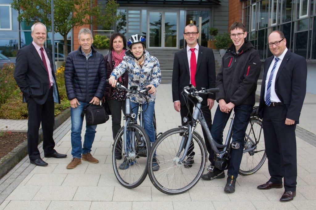 Im Rahmen ihres gesellschaftlichen Engagements unterstützt die Vereinigte Volksbank Raiffeisenbank in Wittlich seit vielen Jahren die Maria-Grünewald-Schule mit einer sogenannten Mobilitätspatenschaft. Dank dieser Hilfe konnte die Wittlicher Schule mit den Förderschwerpunkten ganzheitliche und motorische Entwicklung bereits eine Kletterwand und ein Mofa anschaffen. Mit der jüngsten Finanzspritze in Höhe von 3.000 Euro kaufte die Förderschule E-Bikes für die Schüler. Die Elektrofahrräder kommen in der Schulgemeinschaft gut an, das Fahren macht richtig viel Spaß. Davon konnten sich auch die Vertreter der Vereinigten Volksbank Raiffeisenbank bei der Übergabe überzeugen. Foto. Schule