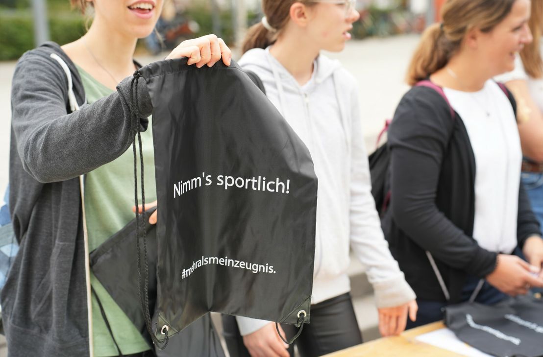 Mit der Zusage: "Du bist mehr als Dein Zeugnis!" gingen Jugendarbeiterinnen und Jugendarbeiter in Wittlich am letzten Schultag auf Schülerinnen und Schüler zu. Mit dem Zeugnis in der Tasche wurde ihnen vor Schulen und am Busbahnhof fast 1000 Turnbeutel in die Hand gedrückt. Die Aufschrift: "Nimm's sportlich! #mehralsmeinzeugnis." Und auf einem Riesen-Rucksack-Plakat-Aufsteller auf dem Omnibusbahnhof konnten sie sich selbst äußern: "Nimm's sportlich: Wo steckt Deine Kraft? Worin bist Du stark? Was kannst Du gut?"