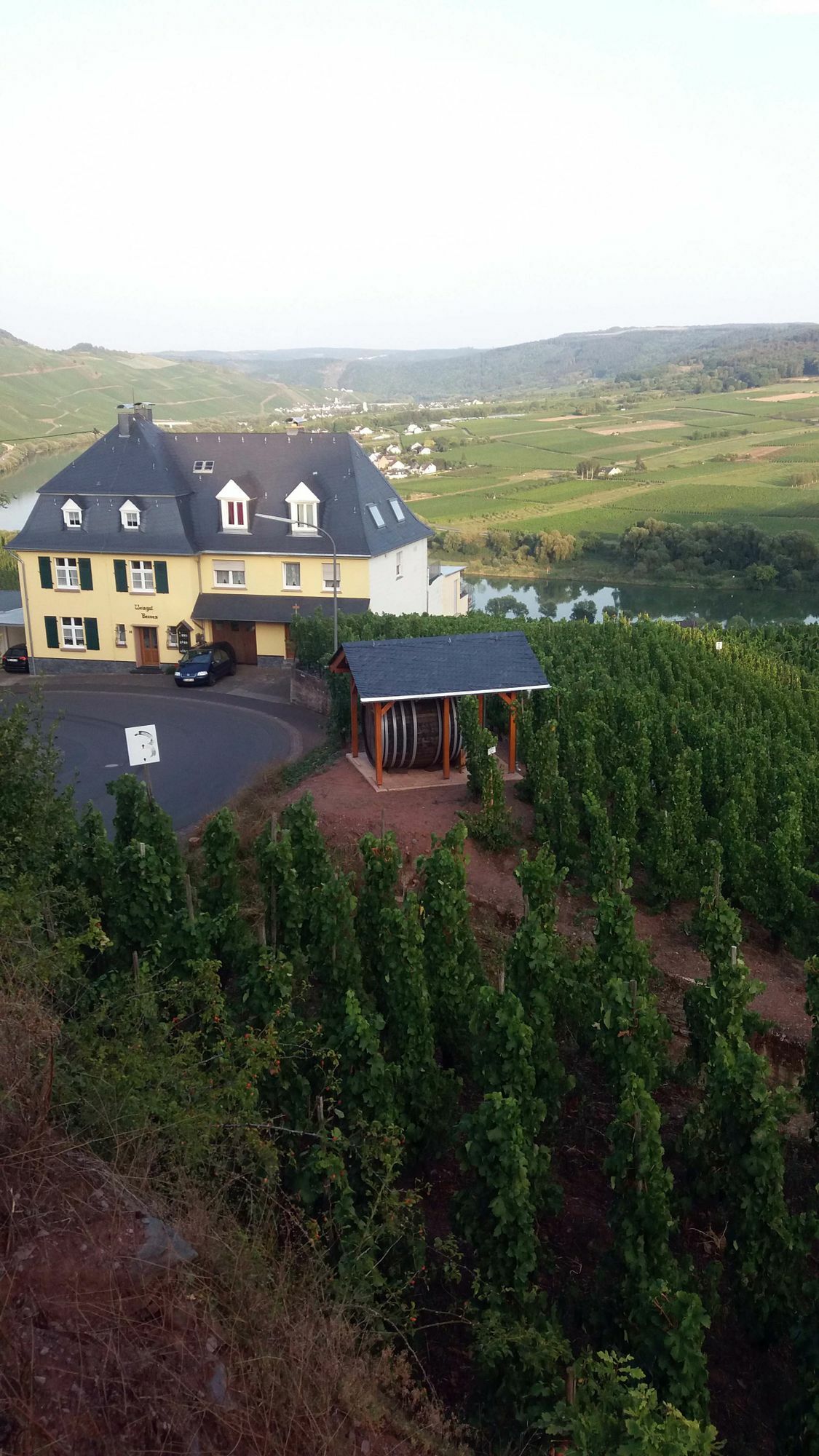 „Die Idee“, so Berres, „an dieser exponierten Stelle, wo der Moselklettersteig unmittelbar vorbeiführt, etwas Touristisches und Weinbezogenes zu erstellen, war schon länger von mir geplant. Bei der Mosel-Sektkellerei Otto Treis in Zell-Merl wurde ich dann fündig. Ein 5320 Liter fassendes Weinfass hergestellt von der Firma Diemer und Roth in Stuttgart im Jahre 1942 konnte ich von Marcus Treis, Besitzer der ältesten Sektkellerei an Mosel-Saar-Ruwer, erwerben.“