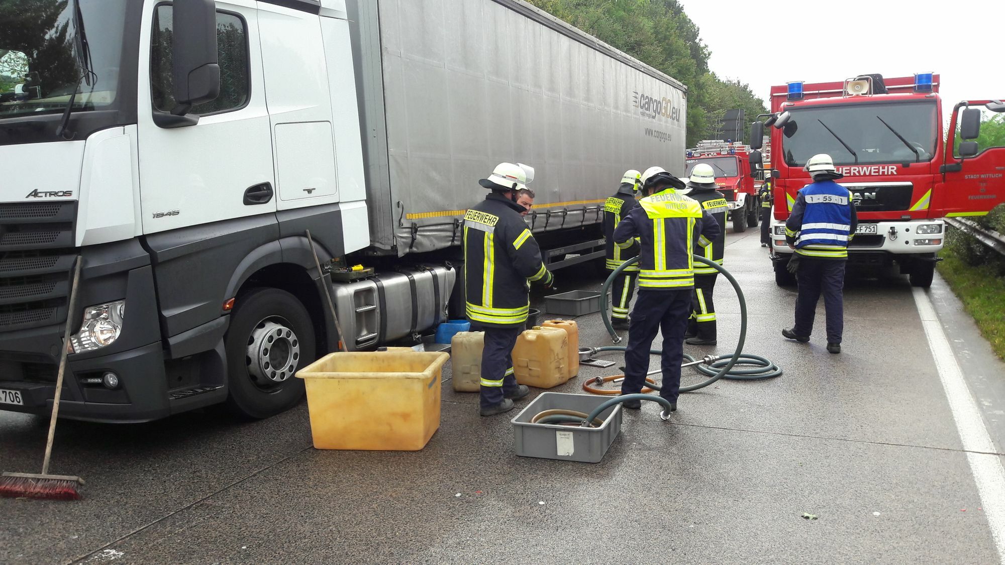 Zu erheblichen Verkehrsbehinderungen kam es am Mittwoch, 13. September, auf der A 1 zwischen den Anschlussstellen Schweich und Salmtal in Fahrtrichtung Koblenz. Ein Pkw- Fahrer kam gegen 11.30 Uhr vor der AS Salmtal bei Regen vermutlich wegen nicht angepasster Geschwindigkeit ins Schleudern, prallte gegen die Mittelschutzplanke und von dort gegen einen Sattelzug. Dabei wurde der Dieseltank des Sattelzugs beschädigt, wodurch Kraftstoff auslief. Bis zum Eintreffen der alarmierten Feuerwehr Hetzerath und des Gefahrstoffzugs der FFW Wittlich fingen hilfsbereite Verkehrsteilnehmer den auslaufenden Kraftstoff mittels Notbehältnissen wie Mörtelkübel auf und verhinderten größere Umweltschäden. Aufgrund der Bergungs- und Reinigungsarbeiten musste die A 1 für 2 Stunden voll gesperrt werden, wodurch sich der Verkehr trotz Ableitungsmaßnahmen durch die Autobahnmeisterei und Polizeiautobahnstation Schweich zeitweise bis zur AS Schweich auf 8-10 km Länge zurückstaute. Beide Fahrzeuge mussten abgeschleppt werden. An ihnen entstand Sachschaden in Höhe von etwa 30.000 Euro. Besonders ärgerlich für den Pkw-Fahrer war, dass er das hochwertige Fahrzeug erst unmittelbar vor dem Unfall im Bereich Trier gekauft hatte und auf dem Heimweg war. Menschen kamen nicht zu Schaden. Die Anfahrt zum Einsatzort wurde teilweise durch das nicht ordnungsgemäße Bilden einer Rettungsgasse erschwert. Die Polizei weist darauf hin, dass laut aktueller Rechtslage eine Rettungsgasse bei jedem Stau bzw. stockendem Verkehr sofort und nicht erst bei Erscheinen von Einsatzfahrzeugen zu bilden ist und diese auch für eventuell nachrückende Kräfte freizuhalten ist.
