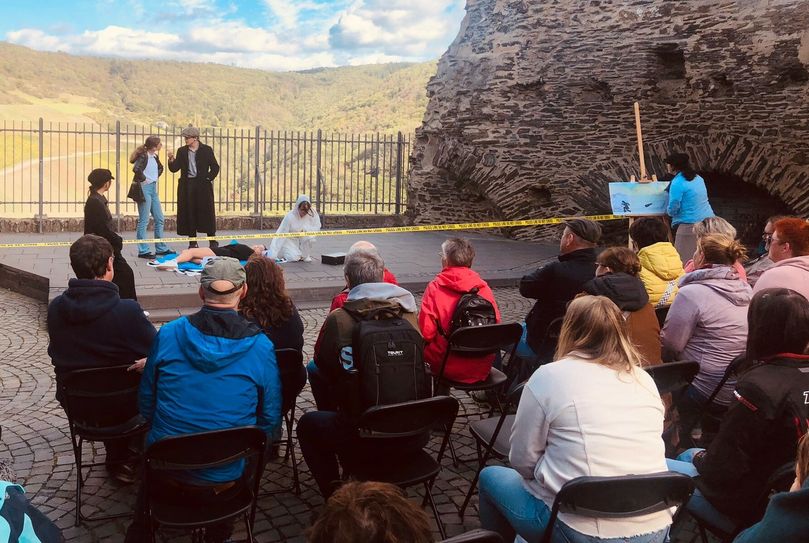 Die Thetaerwanderung „Mörderische Auslese“ zog die insgesamt 50 zugelassenen Wanderer in ihren Bann und sorgte am Ende für eine große Überraschung bei der Entlarvung des Mörders. Es geht bei dem von den beiden Lehrern Marcel Petri und Bärbel Theis geschriebenen Stück um die Wahl der neuen Mosella. Vier Kandidatinnen stehen zur Wahl, doch eine nach der anderen fällt heimtückischen Anschlägen zum Opfer. Doch das Krimi Trio N-K-G mit Nicki Blaulicht, Kurt Kappes und Gundula Flatulenz kann den Fall lösen.