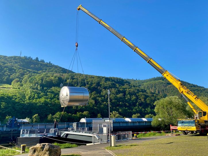 Bernkastel-Kues. Einen seltenen Anblick bieten riesige Edelstahltanks, die zur Weinkellerei Peter Mertes transportiert werden.