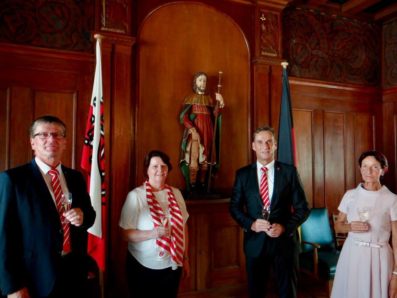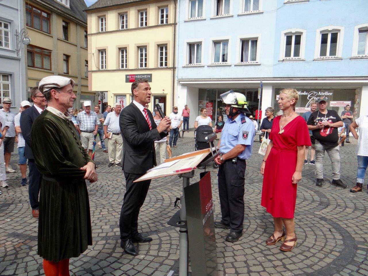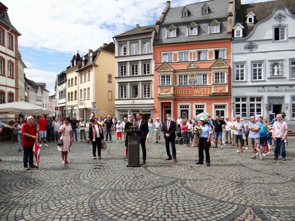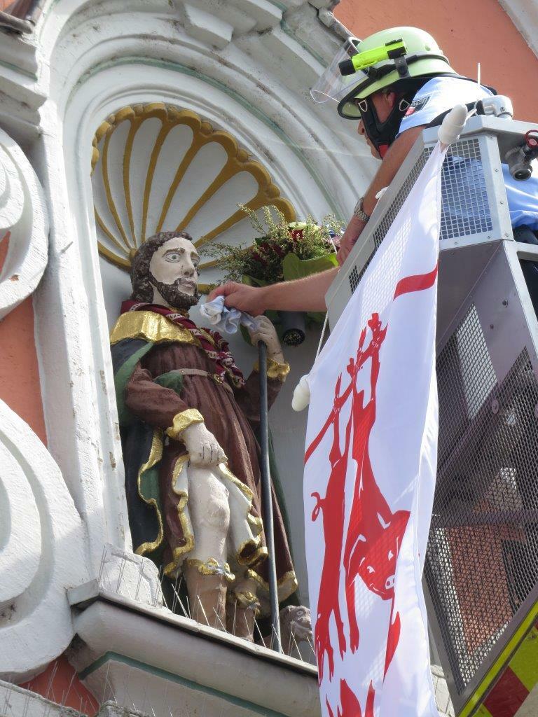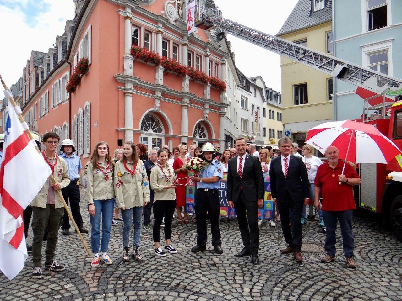 Da St. Rochus schon seit Jahrhunderten als Schutzpatron gegen die Pest angerufen wurde, ist es mehr als sinnvoll auch bei der heutigen Pandemie dem Schutzpatron die Ehre zu erweisen. Der traditionelle Blumengruß, der normalerweise im Rahmen des Festumzuges von der Feuerwehr in historischer Uniform und mit historischer Leiter erfolgt, sollte in aller Stille, nach dem Mittagsläuten und dem Läuten der St. Rochus-Glocke, vollzogen werden. Doch war eine Abordnung der 50-Jährigen und einige interessierte Bürgerinnen und Bürgern auf dem Marktplatz versammelt. Ausnahmsweise durfte Ute Kasper, eine der 50-Jährigen, gemeinsam mit dem Feuerwehrmann Michael Fatter auf der Drehleiter den Blumengruß entbieten und St. Rochus traditionell die Nase putzen. Neben Blumengruß haben die Wittlicher Pfadfinder vom St. Rochus Stamm, der in diesem Jahr sein 75-jähriges Bestehen feiert, zusätzlich St. Rochus ein Halstuch überreichen lassen. Nach der Meldung durch Feuerwehrmann Michael Fatter an Bürgermeister Joachim Rodenkirch wurde durch den Stadtschreiber Detlef Bohr eine Urkunde verlesen, die vom Bürgermeister und den Beigeordneten Elfriede Meurer, Elfriede Marmann und Michael Wagner unterschrieben wurde und an den denkwürdigen pandemiebedingten Kirmesausfall erinnert. Bürgermeister Joachim Rodenkirch dankte allen Beteiligten und betonte die Wichtigkeit von Tradition und hoffte abschließend, dass im nächsten Jahr die Säubrennerkirmes wieder gebührend gefeiert werden könne. red