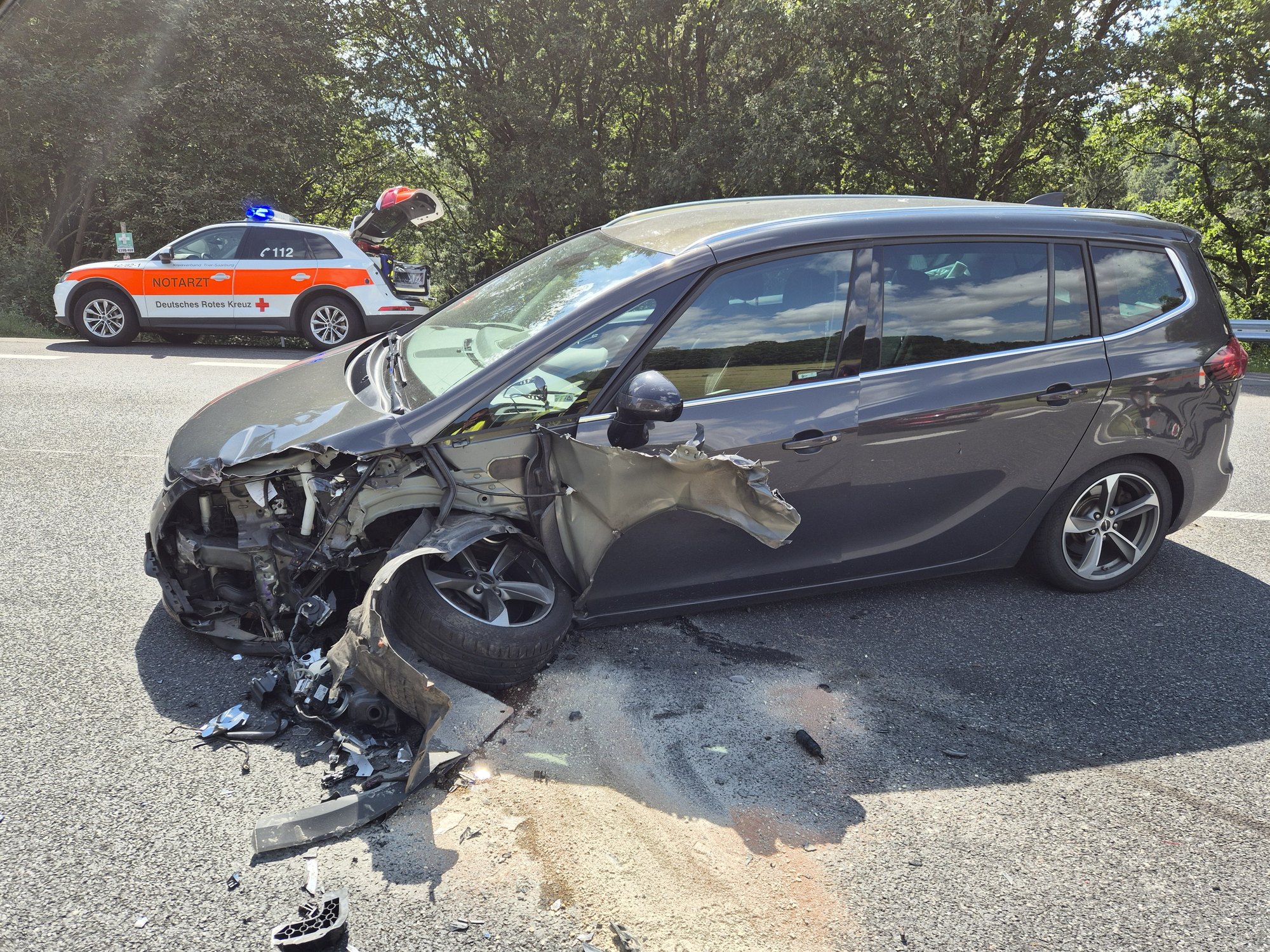 Eine Person wurde im Fahrzeug eingeschlossen und musste von der Feuerwehr befreit werden. Während der Rettungs- und Bergungsarbeiten war die Hunsrückhöhenstraße für den Verkehr vollgesperrt.