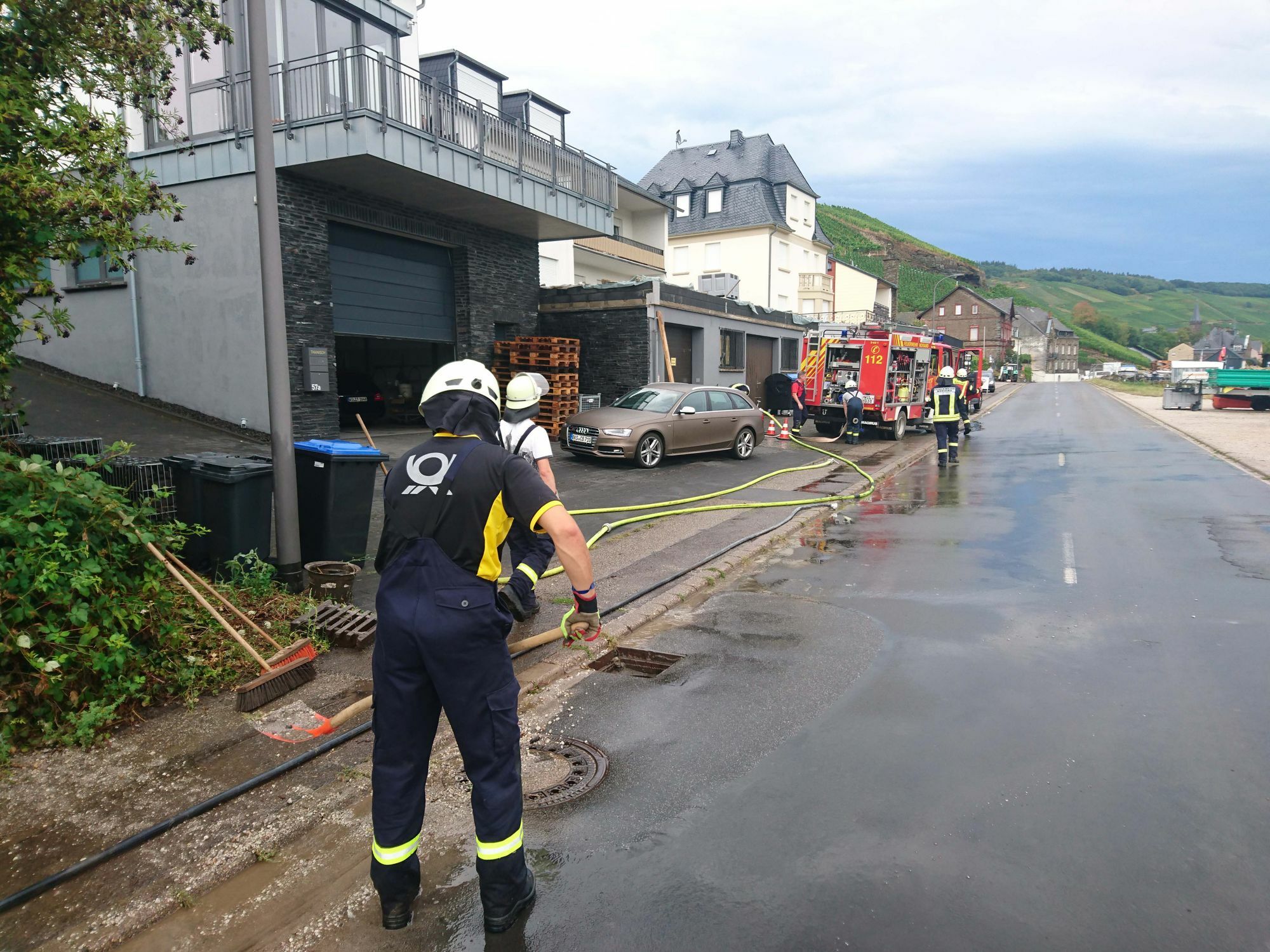 Die Bilder der letzten Unwetter sind noch nicht aus den Köpfchen gewichen, da werden sie bereits durch neue verdrängt: In Lieser ist Ausnahmezustand. Was ist dort passiert? Am Donnerstagnachmittag zog ein schweres Unwetter über die Region Trier hinweg. Weite Teile der Landkreise blieben verschont, nicht so der Kreis Bernkastel-Wittlich und vor allem nicht der bekannte Weinort Lieser. Dort zeichnete sich ein dramatisches Bild: Von den Weinbergen ausgehend durch die "Kirchstraße" und "Am Kirchberg" ergossen sich Wassermassen mit Schlamm und Geröll. Am tiefsten Punkt "Am Markt" liefen zahlreiche Keller bis zu 50 cm hoch voll mit Wasser. Ebenso wurde die L 47/ Moselstraße überflutet. Gullideckel drückten sich nach oben und konnten die Wassermassen nicht mehr aufnehmen. Einsatzkräfte der Feuerwehr wurden gerufen, um die vollgelaufenen Keller leer zu pumpen. In der Hofstraße in Lieser stürzte ein hoher Baum auf ein Haus, der Wintergarten wurde dabei beschädigt. In den Ortschaften um Lieser herum kam es ebenfalls zu zahlreichen Einsätzen aufgrund überfluteter Fahrbahnen und umgestürzter Bäume sowie Reinigungs- und Pumparbeiten. Die Aufräumarbeiten werden andauern, Straßen und Gehwege müssen von Schlamm befreit werden – hier sind auch die Betroffenen mit Besen und Schaufeln aktiv. Feuerwehren im Einsatz: die FEZ und Wehrleitung VG Bernkastel-Kues, die Feuerwehren aus Lieser, Mühlheim, Maring, Noviand, Osann- Monzel und Bernkastel-Kues. Weiter flussabwärts in der VG Traben- Trabach kam es ebenfalls zu zahlreichen Unwettereinsätzen. In Bausendorf mussten zwei Keller leer gepumpt werden. Auf der B 49 Höhe Bausendorf und der B 53 am Kröver Schwimmbad kam kurzzeitig der Verkehr zum Erliegen. Hier wurden die Straßen überflutet. In Traben und Köwenig musste die Feuerwehr umgestürzte Bäume wegschneiden. Fotos: privat