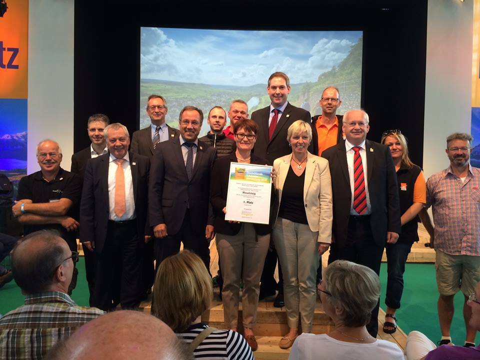 Sichtlich erfreut nahmen Landrat Gregor Eibes, Aufsichtsratsvorsitzender der Mosellandtouristik, Geschäftsführerin Sabine Winkhaus-Robert und ihr stellvertretender Geschäftsführer Thomas Kalff die Siegerurkunde "Deutschlands Schönster Wanderweg 2016" für den Moselsteig von Wandermagazin-Autor Manuel Andrack entgegen. Damit erlangt der Moselsteig zwei Jahre nach seiner Eröffnung und den Zertifizierungen als "Qualitätsweg Wanderbares Deutschland" und "Leading Quality Trail – Best of Europe" erneut eine begehrte Auszeichnung. Seit April 2014 begleitet der Moselsteig auf 365 Kilometern Wegstrecke die Mosel von Perl an der deutsch-französisch-luxemburgischen Grenze bis zur Mündung in Koblenz und verbindet auf 24 Etappen landschaftliche und kulturelle Höhepunkte des weltberühmten Weinkulturlandes miteinander. Unmittelbar am Steig gelegen oder über kurze Zuwege erreichbar sind viele Sehenswürdigkeiten und Moselorte angebunden, so dass Wanderer innerhalb kürzester Distanz Einkehrmöglichkeiten und Übernachtungsquartiere vorfinden. "Wir danken allen, die für uns abgestimmt haben", sagte Landrat Eibes. Die Auszeichnung "Deutschlands schönster Wanderweg" sei ein großes Lob vom Publikum an alle Beteiligten, die zum Erfolg des Moselsteigs beigetragen haben, wie Kommunen, Moselsteig-Wanderpaten und wanderfreundliche Unterkünfte und Gastronomiebetriebe am Moselsteig. Von Anfang Januar bis Ende Juni 2016 konnten Wanderbegeisterte ihre Stimme für eine von zehn nominierten Tagestouren und einen von fünf nominierten Weitwanderwegen abgeben, die ihnen am besten gefielen. Im Rahmen der Feierstunde auf der Wander- und Trekkingmesse TourNatur in Düsseldorf erhielten die jeweils drei Erstplatzierten Wege Ihre Urkunden überreicht. In der Kategorie Tagestouren sicherte sich der Wasserfallsteig in Bad Urach mit fast 31 Prozent der Stimmen den ersten Platz. Über Platz zwei freute sich der Wanderweg Galgenvenn im Naturpark Schwalm-Nette am Niederrhein, über den dritten Platz die Traumschleife Rheingold in Boppard. Bei den Weitwanderwegen schaffte es der Werra-Burgen-Steig (Hessen) auf Platz zwei, der Rennsteig (Thüringen) auf Platz drei. Foto: Mosellandtouristik www.moselsteig.de