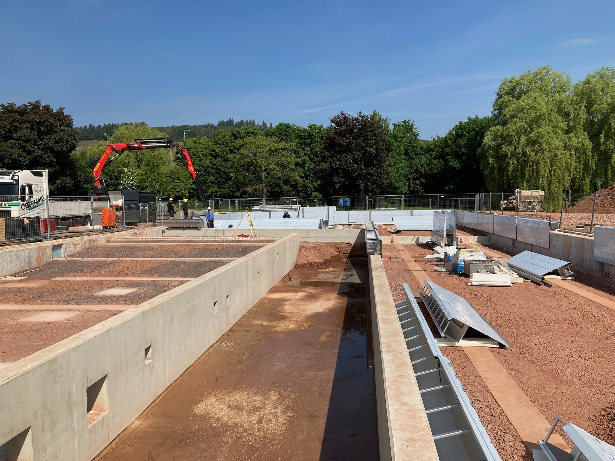 Die Großkomponenten der technischen Gewerke, wie zum Beispiel die drei Lüftungsgeräte mit Wärmerückgewinnung und einer Gesamtlüftungsleistung von 58.300 Kubikmeter Luft / h wurden mit insgesamt acht Sattelschleppern angeliefert und fachgerecht aufgebaut. Auch die sechs Pufferspeicher für die Holzhackschnitzelheizung mit jeweils 5.000 Kubikmeter Inhalt sind bereits montiert. Die Sandfilter der einzelnen Wasserkreisläufe stehen am richtigen Ort und wurden schon mit Filtersand gefüllt. Auch im großen Freibadbecken sind die ersten Veränderungen zu erkennen.
