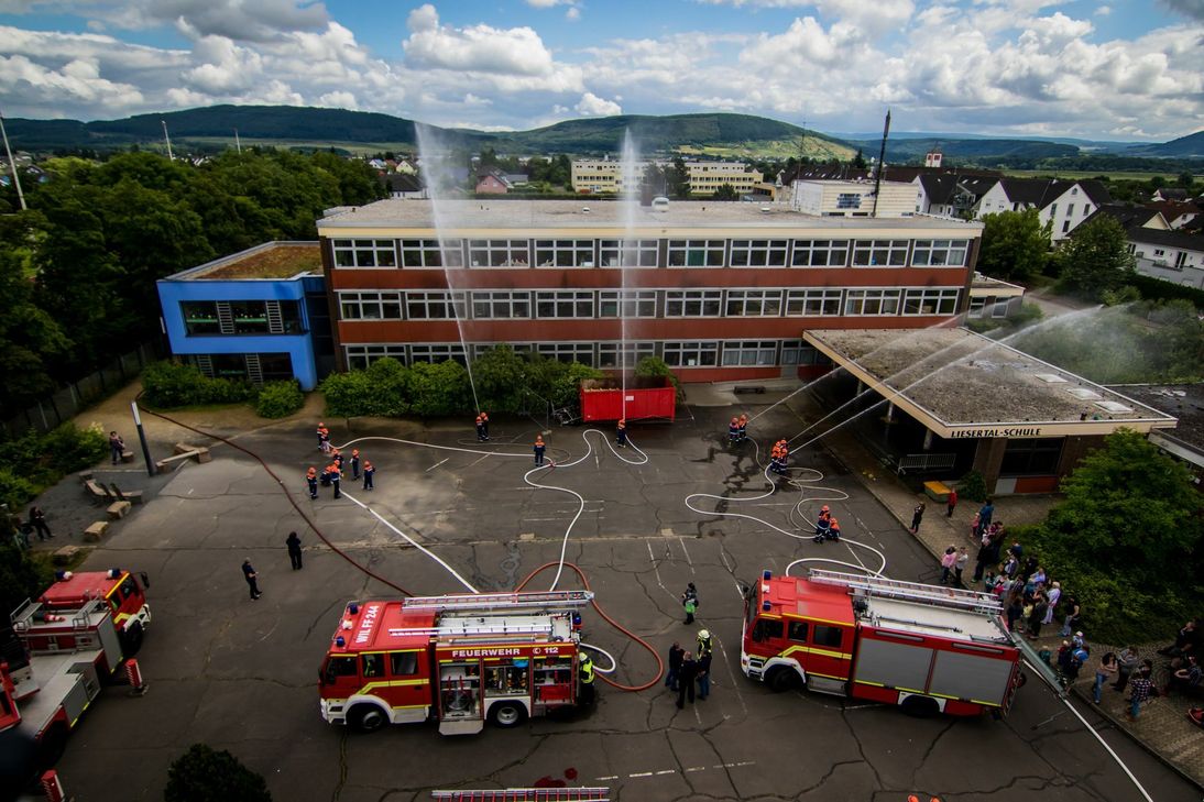 Über 40 Mitglieder der drei Jugendfeuerwehren der Stadt zeigten bei einer Übung an der Liesertalschule ihr Können. So gehörten Löschen, Menschenrettung und das Auffangen einer auslaufenden Flüssigkeit zu den Aufgaben, die der Feuerwehrnachwuchs sicher meisterte. Der Einsatzleitwagen rief die einzelnen Standorte wie bei einer richtigen Alarmierung ab. Angenommen wurde ein Brand in der Schule, zwei Personen konnten das Gebäude nicht mehr verlassen und mussten über Leitern gerettet werden. Die zuerst eintreffenden Jugendlichen vom Standort 2 (Wengerohr/Bombogen) leiteten sofort die erforderlichen Maßnahmen ein. Die kurze Zeit später eintreffenden Kräfte vom Standort 1 (Standmitte) unterstützten sie dabei. Um die benötigte Menge an Löschwasser zur Einsatzstelle zu bringen, bauten die Mitglieder vom Standort 3 (Neuerburg/Dorf) eine Wasserversorgung auf. Während der Lösch- und Rettungsarbeiten wurde festgestellt, dass aus einem Behälter eine unbekannte Flüssigkeit ausläuft. Über den Ausbildungsstand der Jugendlichen machten sich neben der Wehrleitung, auch viele Eltern, Vertreter des politischen Lebens und private Zuschauer ein Bild. Foto: Feuerwehr Wittlich