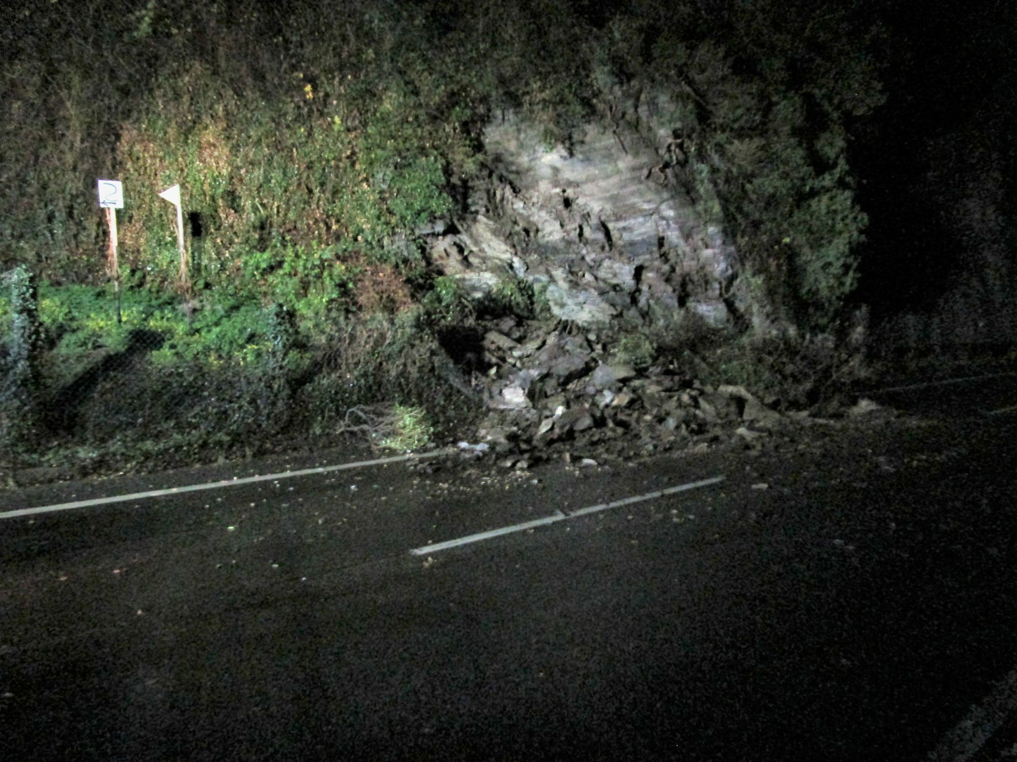 Am Montag, 3. Dezember, kam es infolge des Starkregens der vergangenen Tage, gegen 19.25 Uhr zu einem Felssturz auf die Bundesstraße 53 zwischen Enkirch und Traben-Trarbach, gegenüber des Trabener Yachthafens. Insgesamt lösten sich etwa 30 Tonnen Gesteinsmassen aus dem Felsen und stürzten auf die Straße. Verkehr gab es zu diesem Zeitpunkt nicht auf der Fahrbahn. Experten sollen nun schnellstmöglich klären, ob eine Gefahr besteht, dass weitere Gesteinsmassen auf die Straße fallen könnten. Die Freiwilligen Feuerwehren Trarbach und Enkirch, die Straßenmeisterei und die Polizei waren im Einsatz und sicherten die betroffene Stelle ab. Während der Bergungsarbeiten wurde eine dreieinhalbstündige Vollsperrung der B 53 erforderlich. (red/PI Zell)