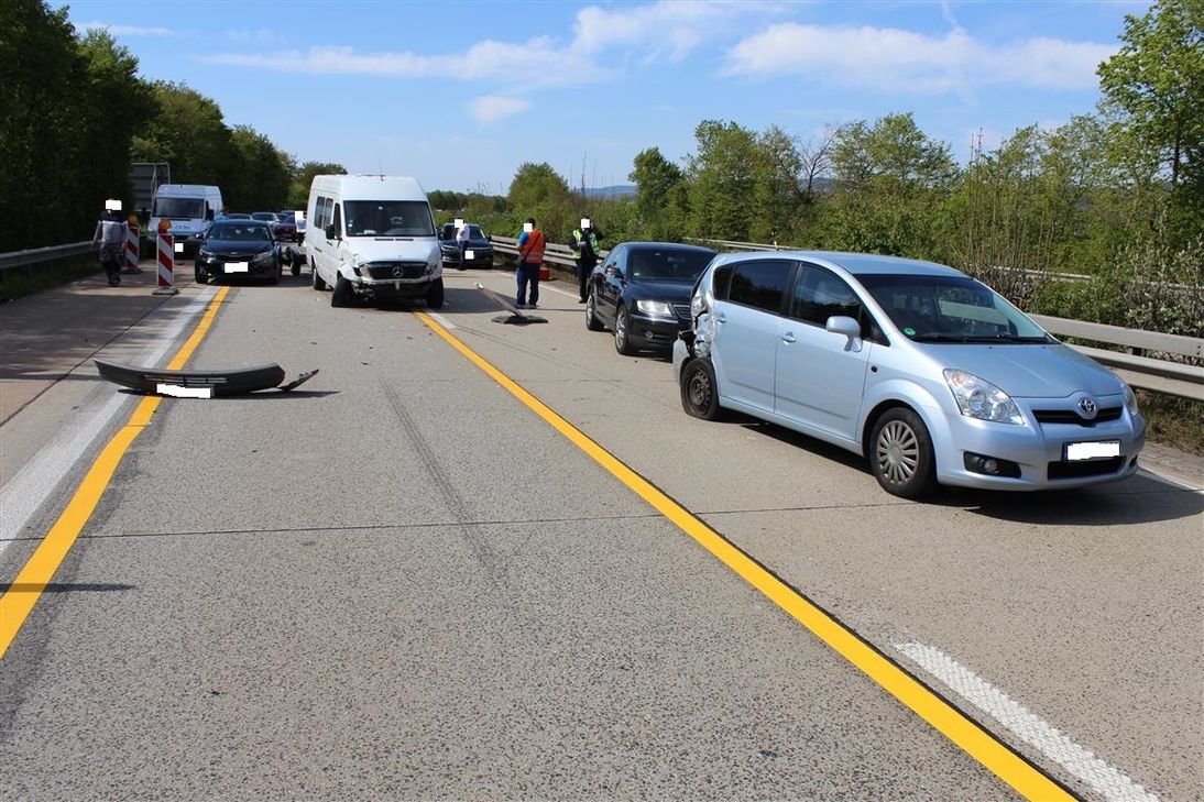 Am Sonntag gegen 10.50 Uhr kam es auf der BAB 1, Richtung Koblenz, am Baustellenbereich kurz vor dem Autobahnkreuz Wittlich zu einem Verkehrsunfall mit drei Fahrzeugen, bei dem hoher Sachschaden entstand und eine Person leicht verletzt wurde. An einer Fahrbahnverjüngung von zwei auf einen Fahrstreifen durch einen Baustellenbereich bremste ein schwarzer KIA auf dem rechten Fahrstreifen, um den links neben sich fahrenden Toyota einfädeln zu lassen. Diese Situation erkannte ein Fahrer eines Sprinters mit Anhänger zu spät. Er hatte ohnehin zu geringen Sicherheitsabstand eingehalten und fuhr auf beide Fahrzeuge mittig auf. Hierdurch wurde der links fahrende Toyota nach links in das Baufeld katapultiert und überfuhr dabei mehrere Warnbaken. Der KIA und der Sprinter kamen auf der Fahrbahn ebenfalls zum Stillstand. Alle drei Fahrzeuge waren nach dem Unfall nicht mehr fahrbereit und mussten durch ortsansässige Bergungsunternehmen geborgen werden. Die Beifahrerin des KIA erlitt durch den Unfall einen Schock und wurde leicht verletzt. Der Sachschaden wird auf ca.25.000 Euro geschätzt. Aufgrund der zunächst unübersichtlichen Unfallsituation und der Unfallaufnahme wurde die BAB 1 für die Dauer von 45 Minuten voll gesperrt, danach konnte der Verkehr bis zur Bergung der Fahrzeuge einspurig an der Unfallstelle vorbeigeleitet werden. Es kam hierdurch zu einem fünf Kilometer langen Stau. Foto:Polizei