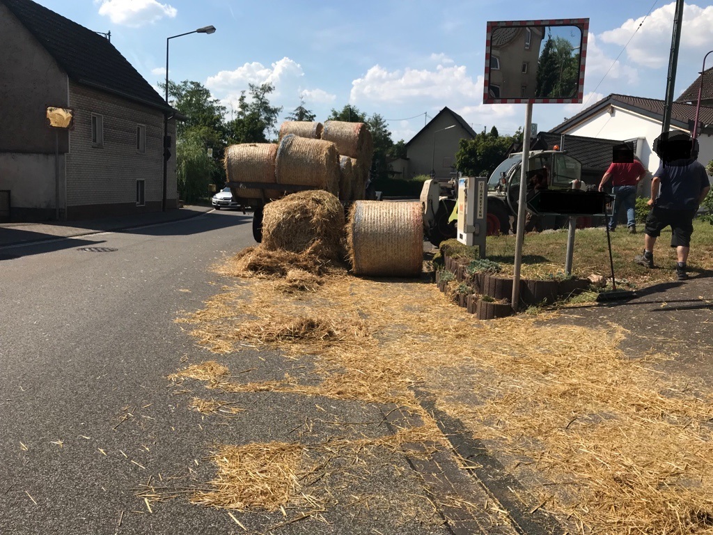 Am Freitag, 27. Juli, befuhr ein Landwirt gegen 16 Uhr mit seinem Traktor inklusive Anhänger die Dorfstraße in Kinderbeuern, als er beim Abbiegevorgang nach links in die Hauptstraße Teile seiner Ladung verlor. Drei Rundballen Stroh fielen nach rechts auf den Bürgersteig. Glück im Unglück: Auf dem Bürgersteig waren zu diesem Zeitpunkt keine Personen unterwegs. Dass die Strohballen so einfach von der Ladeflächen fielen, war der Tatsache geschuldet, dass der Landwirt seine Ladung nicht gesichert hatte. Vor diesem Hintergrund appelliert die Polizei an alle Landwirte, Transporte mit Rundballen in geeigneter Form zu sichern. Sie weist ferner darauf hin, dass Verstöße gegen die Ladungssicherheit - in diesem Fall in Verbindung mit einer erheblichen Beeinträchtigung der Verkehrssicherheit - mit nicht unerheblichem Bußgeld geahndet werden. Foto: FF