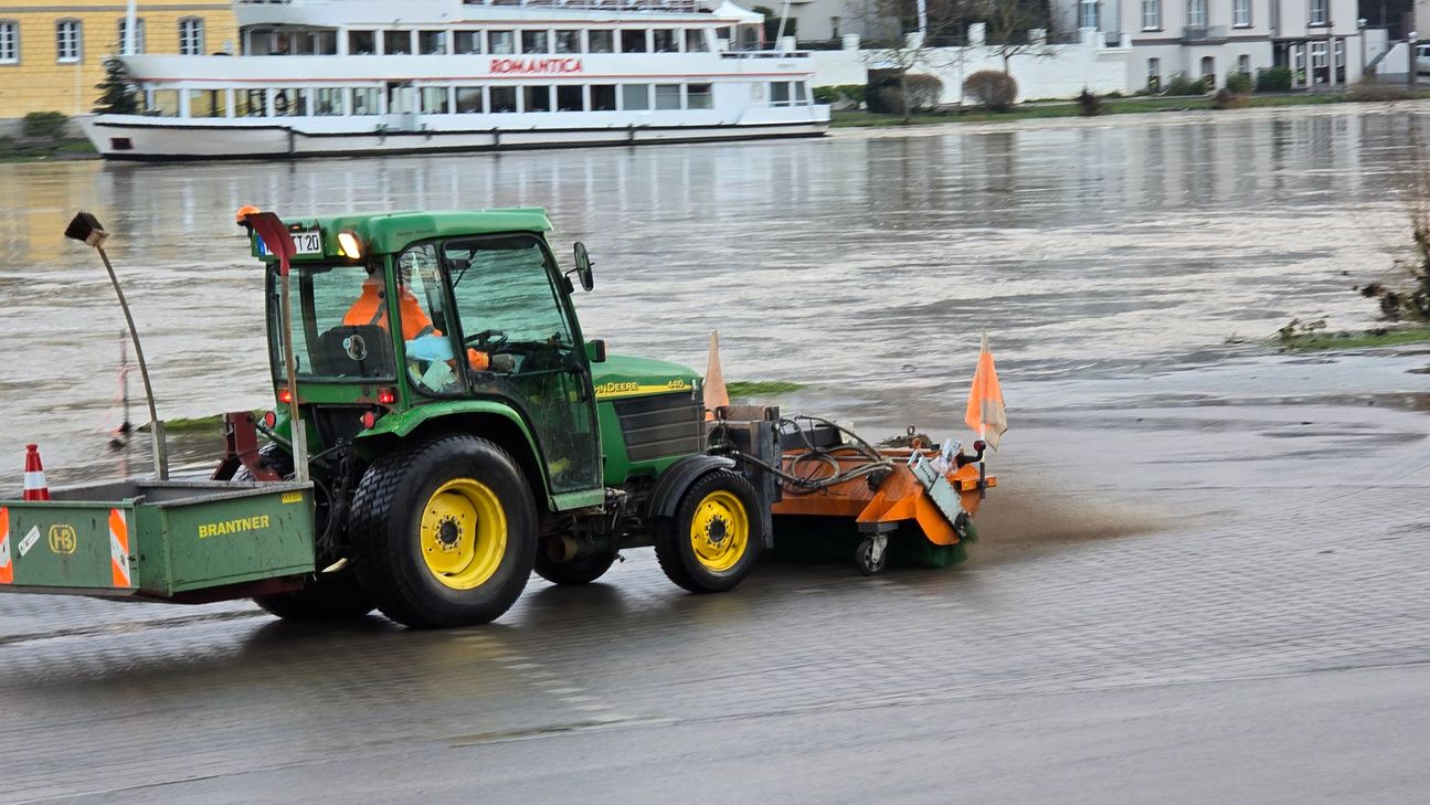Mithilfe von leistungsstarken Pumpen wird Wasser direkt aus der Mosel entnommen, um den hartnäckigen Schlamm von den Straßen zu spülen. Unterstützt wird die Arbeit durch zwei Kehrbesen, die den Schlamm auflockern.