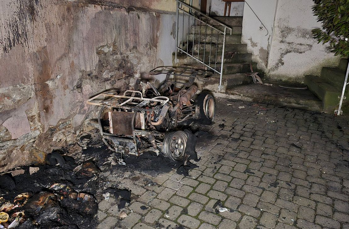 Gegen 0.20 Uhr wurde die Polizei Zell über das Feuer im Innenhof des Mehrfamilienhauses informiert. Vor Ort stellte sich heraus, dass zwei Mülltonnen und ein Quad in Flammen standen.
