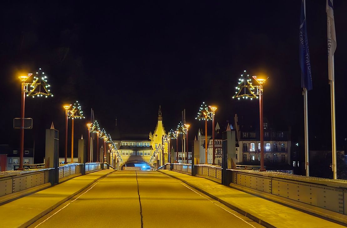 Auf der Moselbrücke zwischen den Stadtteilen Traben und Trarbach begrüßen festlich beleuchtete Bäumchen die Besucher und Bewohner und verbreiten bereits jetzt Adventsstimmung. Diese Dekoration gehört schon vielen Jahren fest zur Tradition der Stadt.