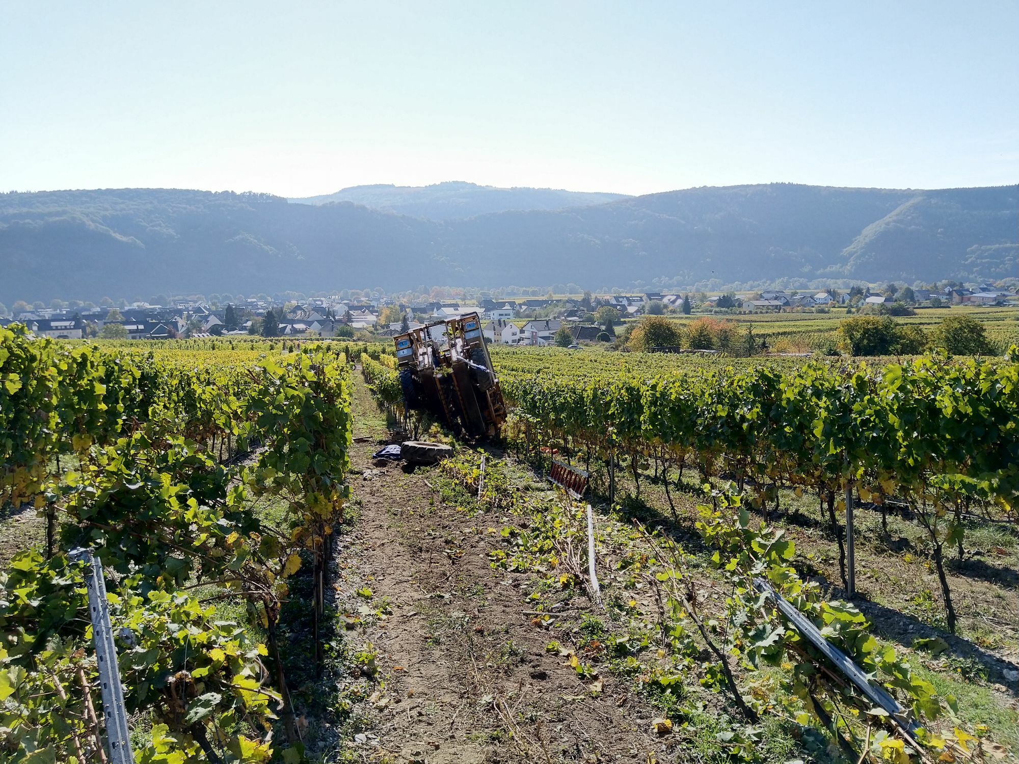 Zu einem tragischen Unfall kam es am Sonntagvormittag gegen 11.30 Uhr bei der Traubenlese in der Gemarkung Kröv. Während der Lesearbeiten im Weinberg kippte ein Traubenvollernter um. Der Fahrer wurde bei dem Unfall tödlich verletzt. Die Ermittlungen laufen.Foto: Polizei