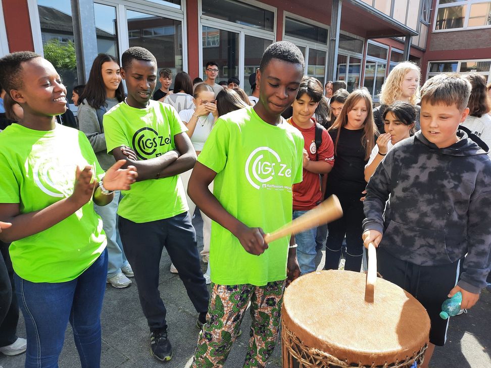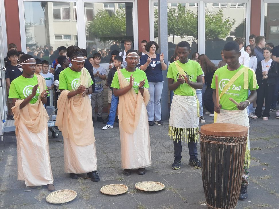 Ein Höhepunkt des Besuchs war eine lebendige Tanzvorführung der ruandischen Gäste auf dem Schulhof während der großen Pausen. Im Anschluss konnten die deutschen SchülerInnen selbst aktiv werden und das Trommeln ausprobieren - ein Erlebnis, das für Begeisterung auf beiden Seiten sorgte.