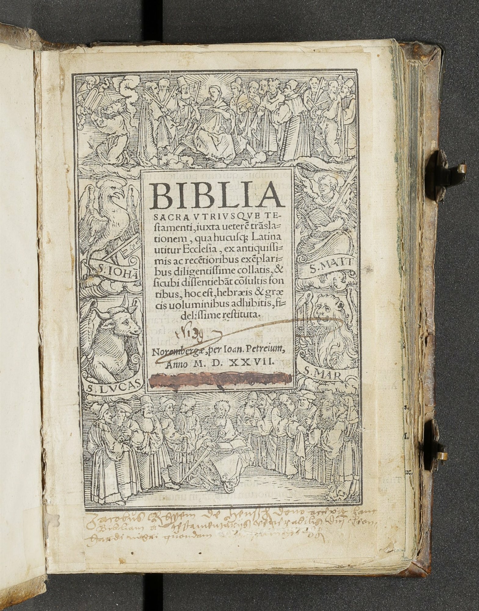 Dem Verhandlungsgeschick des aktuellen Rektors Leo Hofmann und dem großzügigen Entgegenkommen des niederländischen Antiquars ist es zu verdanken, dass die 1527 bei Johannes Petreius in Nürnberg gedruckte Bibel nun wieder ihren angestammten Platz in der Hospitalsbibliothek einnehmen kann.