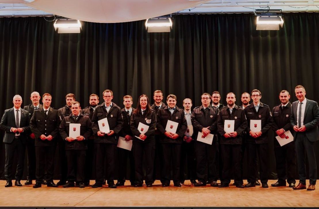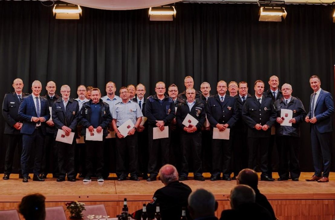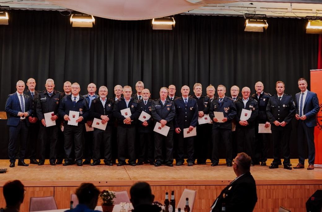 Insgesamt 78 Mitglieder der Feuerwehren der Verbandsgemeinde Wittlich-Land wurden für 15, 25, 35 und 45 Jahre Dienst mit dem Feuerwehr-Ehrenzeichen des Landes Rheinland-Pfalz geehrt. Die Auszeichnungen überreichten der Erste Kreisbeigeordnete Dennis Junk und Bürgermeister Manuel Follmann.