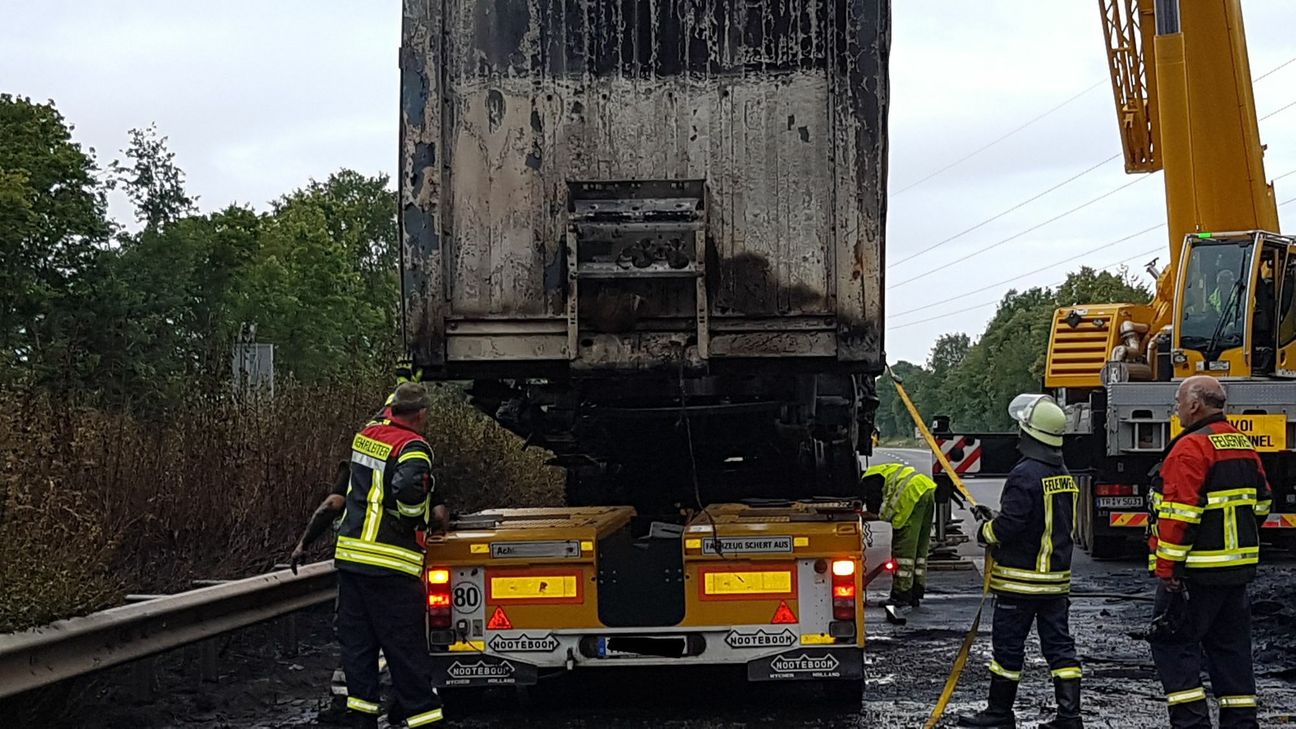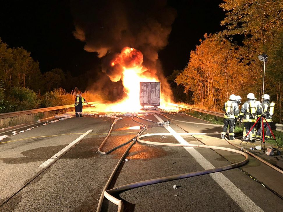 Der 32 jährige Fahrer hatte die Sattelzugmaschine noch rechtzeitig abkuppeln können, bevor der Anhänger in Vollbrand geraten war. Er war mit 6 Tonnen Plastikrollen beladen. Der Lkw-Fahrer blieb unverletzt. Ursächlich für den Brand ist vermutlich ein Defekt an der Bremsanlage. Nach ersten Schätzungen beläuft sich der Gesamtschaden auf ca. 120.000 Euro. Für die schwierigen Löschmaßnahmen mussten beide Richtungsfahrbahnen der A 1 voll gesperrt werden. Der Verkehr in Richtung Trier wird am AK Wittlich auf die A 60 umgeleitet. Der fließende Verkehr in Richtung Koblenz wurde an der AS Föhren abgeleitet. Die Vollsperrung dieser Richtungsfahrbahn konnte gegen 04:10 Uhr aufgehoben werden. Im Einsatz waren die Feuerwehren aus Salmtal, Hetzerath, Landscheid, Burg-Salm und Schweich, die Autobahnmeisterei Wittlich, die Polizeiinspektion Schweich und die Autobahnpolizei Schweich. Die Polizei teilt mit, dass die einspurige Verkehrsführung noch zwei Tage aufrechterhalten werden muß, bis die Fahrbahn erneuert ist. Der großflächige Schaden an der Fahrbahn, ca. 230 Quadratmeter Fahrbahn und 44 Meter Schutzplanke wird Kosten in Höhe von ca. 50.000 Euro verursachen. Fotos: GEIDIES