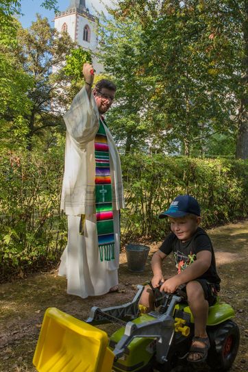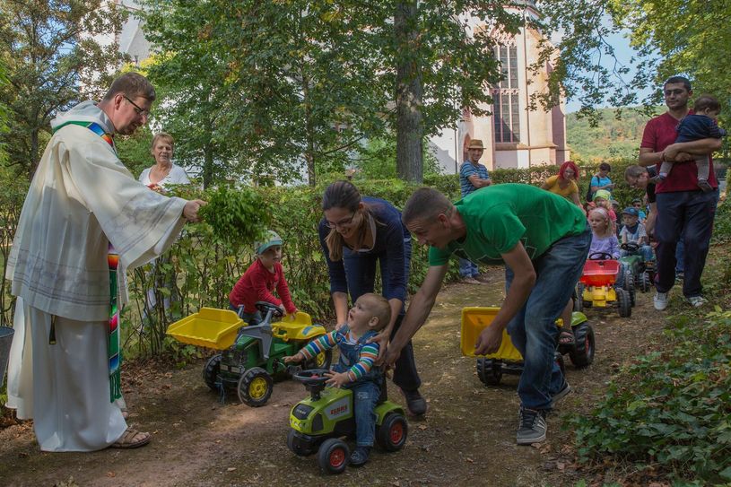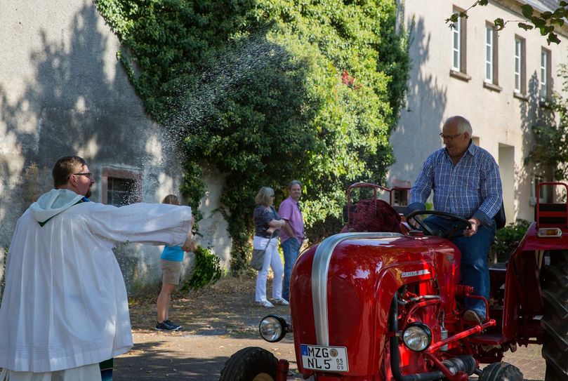 Die Eberhardstraße in Klausen war am Sonntag, 25. September, ganz in der Hand von Schleppern und Traktoren. Zum dritten Mal hatte die Pfarr- und Ortsgemeinde Klausen zur Traktorwallfahrt nach Klausen eingeladen. Rund 90 Traktoren kamen bei strahlendem Sonnenschein nach Klausen, jedes Fahrzeug auf Hochglanz poliert. Nachdem am Vormittag die Traktoren angereist waren, gab es eine kurze Andacht mit Wallfahrtsrektor Pater Albert Seul OP am alten Weiher, direkt neben den Traktoren. Vor dem Korso segnete er alle Fahrzeuge. Pater Albert ist dafür bekannt, dass er nicht mit Weihwasser spart. So waren es am Ende acht Liter Weihwasser, die den Weg auf die Traktoren gefunden hatten. Der Korso ging über Sehlem, Esch und zurück über Krames nach Klausen. Nach dem Korso überreichte Ortsbürgermeister Alois Meyer Familie Enders aus St. Thomas einen Preis für die weiteste Anreise mit ihrem Deutz Traktor. Familie Enders sagte: "Klausen ist immer eine Reise wert und deshalb fahren wir auch gerne die 40 km." Christoph Ebert aus Piesport erhielt eine Auszeichnung für seinen Zettelmeyer Z1 Schlepper. Der war mit Baujahr 1940 das älteste Gefährt. Am Nachmittag machten es die Kleinen den Großen nach. 20 Kinder kamen mit ihren großen und kleinen Spielzeugtraktoren in den Park neben der Wallfahrtskirche. Dort fand eine Andacht zum Erntedankfest statt. Im Anschluss gab es auch hier den Segen durch Pater Albert. Fotos: FF