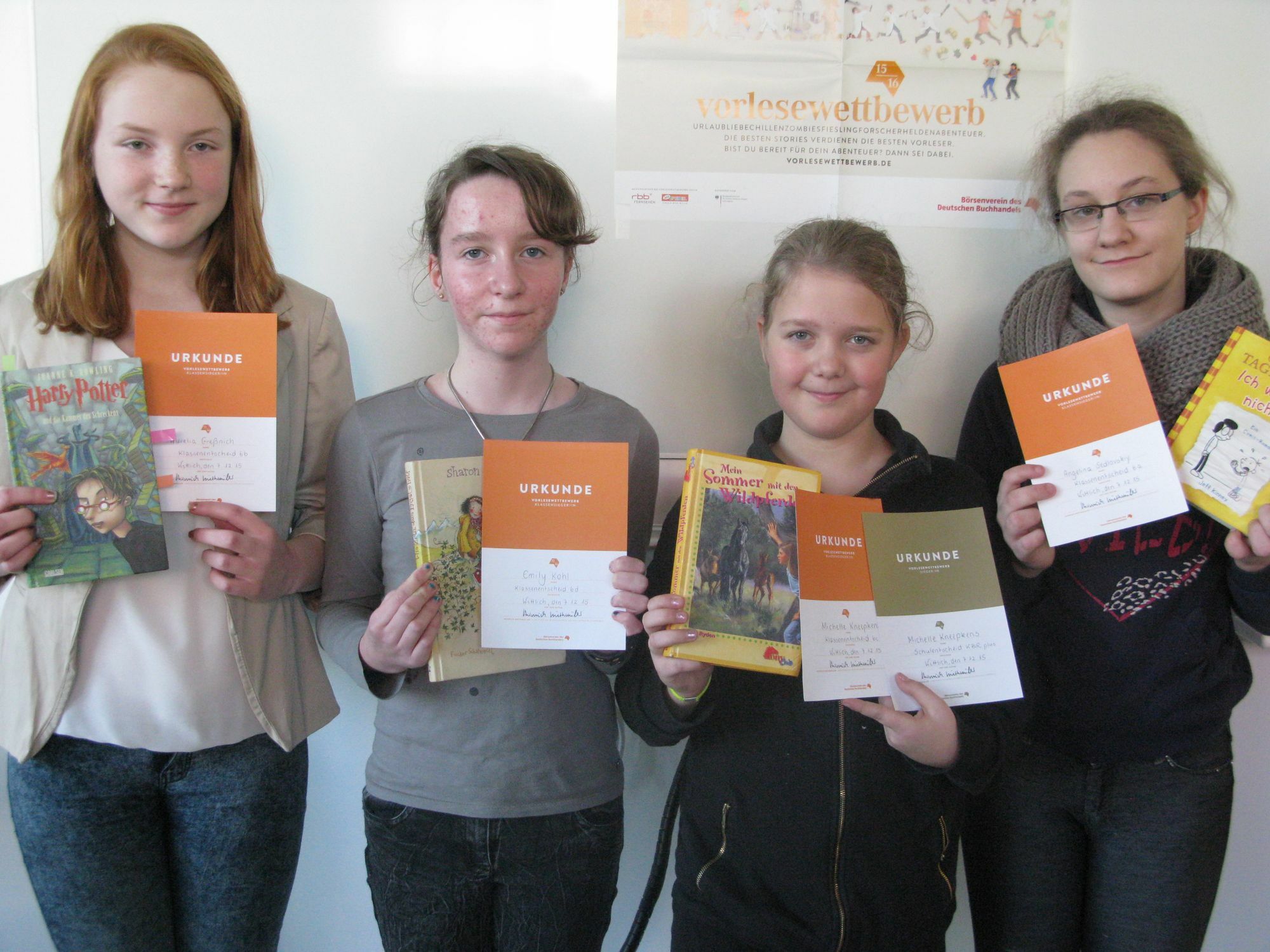 Die Klassensiegerinnen der 6. Klassen der Kurfürst-Balduin-Realschule plus traten am 7. Dezember 2015 an, um den Schulsieger im Vorlesewettbewerb zu ermitteln. Angelina Sedloswkiy (6a), Aurelia Greßnich (6b), Michelle Kneepkens (6c) und Emily Kohl (6d) stellten sich der Jury, die aus Deutschlehrerinnen, der Vorjahressiegerin Melissa Kuslaroglu und Orientierungsstufenleiterin Marita Wuttgen-Heinen bestand. In der ersten Runde lasen die Schülerinnen aus einem selbst gewählten Buch vor, in der zweiten Runde mussten sie sich an einen unbekannten Textauszug wagen. Die Jury wählte als beste Leserin Michelle Kneepkens, die als selbst gewählten Text eine spannende Passage aus Hope Rydens „Mein Sommer mit den Wildpferden“ vorgelesen hatte und auch beim Lesen des unbekannten Textes „Violine und Gitarre“ (Mercedes Neuschäfer-Carlon) überzeugen konnte. Michelle wird im Frühjahr 2016 zum Kreisentscheid antreten. Alle Teilnehmerinnen konnten sich über Büchergutscheine und Urkunden freuen. Foto Die Klassensiegerinnen der 6. Klassen der Kurfürst-Balduin-Realschule plus nahmen am 57. Vorlesewettbewerb des Börsenvereins des Deutschen Buchhandels teil. Auf dem Bild von links nach rechts: Aurelia Greßnich, Emily Kohl, Schulsiegerin Michelle Kneepkens, Angelina Sedloswkiy. Foto: Schule