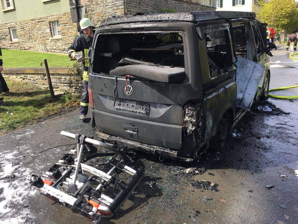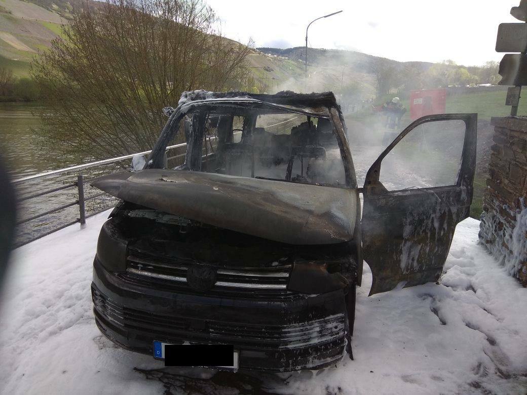 Wie erst jetzt bekannt wurde, kam es am Sonntagmittag gegen 12.10 Uhr in Wehlen in der Uferallee zu einem Feuer in einm VW Camping Bus. Als die erste Feuerwehr vor Ort ankam, stellten sie fest, dass das Fahrzeug bereits im Vollbrand war. Die Insassen des Busses, eine junge Familie, bemerkte während der Fahrt, dass das Fahrzeug zu brennen anfing und konnte das Auto rechtzeitig verlassen. Im Erstangriff wurde ein Übergreifen der Flammen auf die benachbarten Grundstücke verhindert. Unter schwerem Atemschutz konnte das Fahrzeug mit einem Schaumrohr gelöscht werden. Während des gesamten Einsatzes wurde die junge Familie von der Feuerwehr Wehlen betreut. Verletzt wurde niemand, die Schadenshöhe ist noch nicht bekannt. Im Einsatz war die Polizei Bernkastel sowie die Feuerwehren aus Wehlen und Kues. Fotos: Geidies