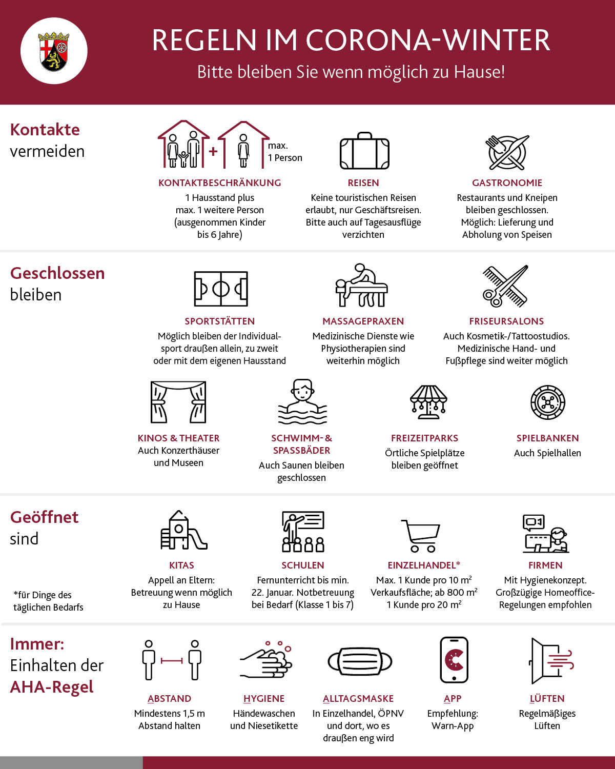 Seit Montag, 11. Januar, gelten verschärfte Kontaktbeschränkungen: Im öffentlichen Raum sind Treffen lediglich mit Personen des eigenen Hausstandes und mit einer weiteren Person zulässig. Dabei werden Kinder bis einschließlich 6 Jahre nicht mitgezählt. Soweit es zwingende persönliche Gründe erfordern, insbesondere wenn eine angemessene Betreuung für Minderjährige oder pflegebedürftige Personen unter Ausschöpfung aller zumutbaren Möglichkeiten nicht umsetzbar ist, ist auch die Anwesenheit mehrerer minderjähriger Personen eines weiteren Hausstands gestattet. Wenn in einer rheinland-pfälzischen Kommune die 7-Tage-Inzidenz 200 Neuinfektionen pro 100.000 Einwohnerinnen und Einwohner übersteigt, kann der Bewegungsradius durch die betreffende Kommune auf 15 km eingeschränkt werden. Mit den neuen Maßnahmen sollen und wollen wir in Rheinland-Pfalz die Gleichung schaffen: Mehr Impfungen plus mehr Schutzmaßnahmen gleich weniger Neuinfektionen gleich mehr Freiheit.