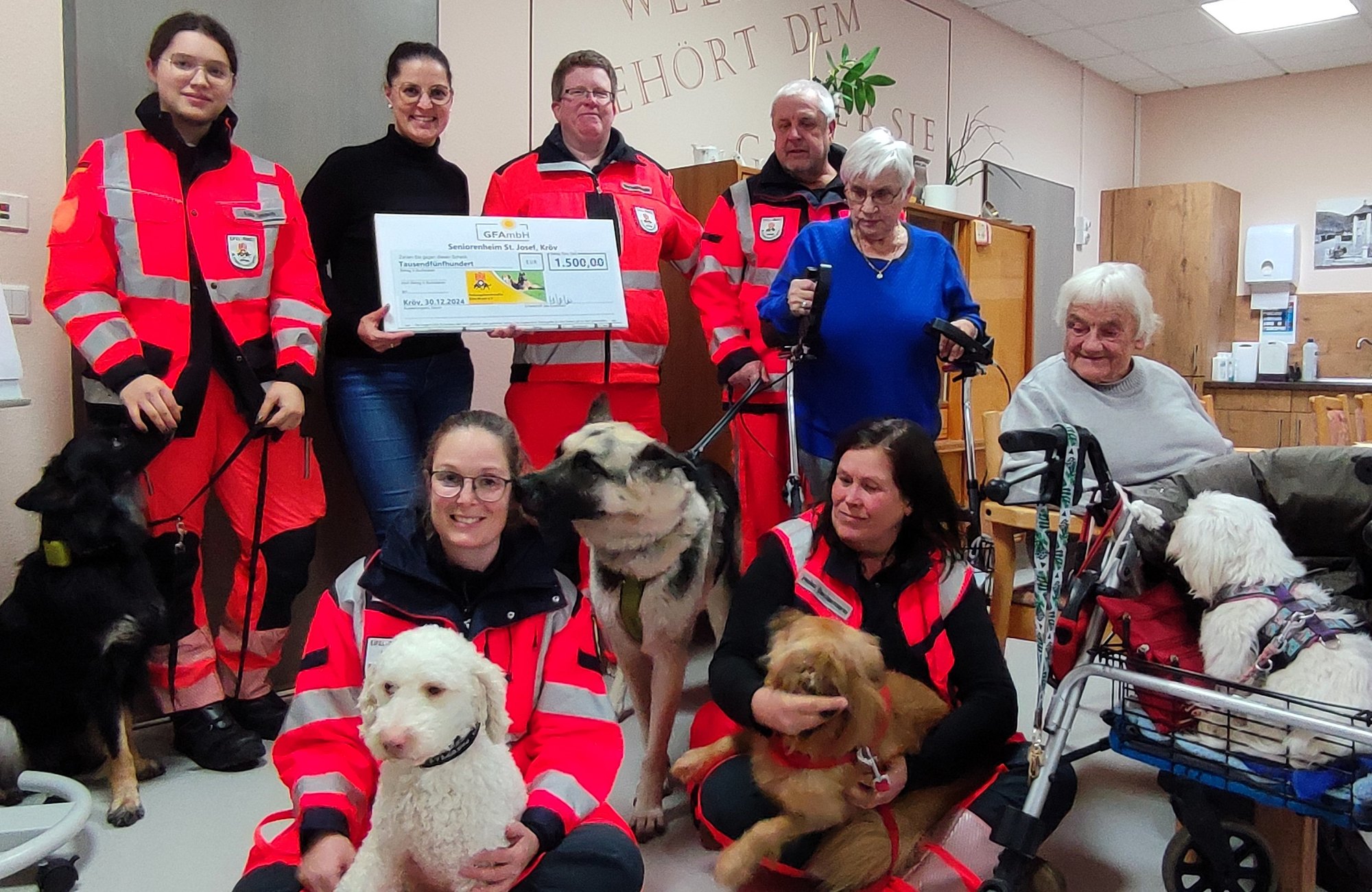 Ende Dezember wurde der Spendenscheck in einer kleinen Feierstunde im Seniorenheim überreicht. Bei Kaffee und Gebäck dankte Einrichtungsleitung Hannah Müller-Vradelis den Rettern mit Herz: „Ihr leistet großartige Arbeit für die Gesellschaft. Es ist uns eine Freude, euch heute hier zu begrüßen.“ Besonders die Rettungshunde Émile, Julius und Coco waren die Stars des Nachmittags und eroberten die Herzen der Anwesenden.