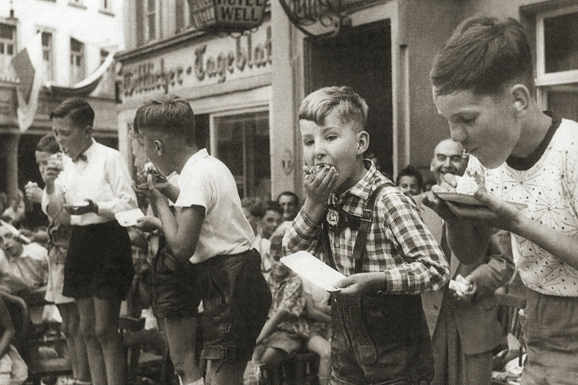 Die Ausstellung „Dilldopp, Klicker, Lebertran – Kindheit in den 50er Jahren in Wittlich“, die noch bis zum kommenden Sonntag, 12. Februar, in der Städtischen Galerie im Alten Rathaus in Wittlich gezeigt wird, stellt in eindrucksvollen Momentaufnahmen und ausgewählten Texten das Leben in den 1950 bis 1959er Jahren dar. Die Entwicklung der Stadt Wittlich und die damit verbundenen Bedingungen für das Leben der Kinder bietet eine passende Erweiterung dieses Themenfeldes. Seine Darstellung übernahm René Richtscheid M.A., Geschäftsführer des Emil-Frank-Instituts und Historiker von Beruf, in einem Vortrag, in dem er vor gut 40 Zuhörerinnen und Zuhörern die Entwicklung des Lebens in Wittlich und die daraus resultierenden Konsequenzen für die Kinder von Beginn bis zum Ende der 50er Jahre des letzten Jahrhunderts schilderte. Lebensmittelkarten und volle Klassenzimmer Wichtiges Thema dieser Zeit war der Stellenwert des Essens. Während Lebensmittel anfangs noch knapp waren und daher rationiert werden musste, bspw. in Form von Lebensmittelkarten, die den Kindern zustanden mit bestimmten Kalorienwerten (1250 bis 1500 Kalorien pro Tag, je nach Alter), oder bei der Schulspeisung in Form eines Eintopfs oder einer Suppe, die den Kindern in mitgebrachte Blechnäpfe gefüllt wurde, gab es bald keinerlei Hungersnöte mehr in Wittlich. Der Stellenwert ausreichenden Essens blieb, was Fotos belegen, die die Kinder bei Kirmesattraktionen wie dem "Würstchenschnappen" oder das "Buttercremeschnittchenwettessen" (siehe Foto) zeigen. Weitere Kuriosität aus heutger Sicht: Die damaligen Wohnverhältnisse. Die Quadratmeter Wohnfläche, die aufgrund der durch die Bombenangriffe von 1944/45 reduzierten Wohnfläche Familien zur Verfügung stand, wirken heute unvorstellbar winzig. Ehepaaren mit bis zu zwei Kindern standen 22 m² zur Verfügung; ab drei Kindern kamen 12 m² zusätzlich hinzu. Auch die Entwicklung der Schulklassen von 1950 bis 1959 ist interessant. Die Größe der Schulklassen war mit 70 Kindern zu Beginn der 1950er Jahre immens, reduzierte sich bis Ende der Dekade auf ca. 30 Kinder. Rege Diskussion Die Besucherinnen und Besucher des Vortrags diskutierten beim Thema "französische Besatzungsmacht" und deren Idee, konfessionsübergreifende staatliche Schulen einzuführen, kräftig mit. Die Idee wurde damals aufgrund der Erfahrungen während des Nationalsozialismus von der Bevölkerung abgelehnt und erst 1968 umgesetzt. Weiterer Anknüpfungspunkt der Erinnerung: Die Arbeit der Sportvereine. Denn auch an die aktive Jugendarbeit der Wittlicher Sportvereine erinnerten sich Gäste und konnten dem Referentin weitere, eigene Eindrücke aus dieser Zeit mit auf den Weg geben. Auch da Richtscheid derzeit mit der Fortführung des Werkes „Geschichte der Stadt Wittlich“ beauftragt ist, dürften ihm diese Informationen sehr gelegen kommen. Foto: FF.
