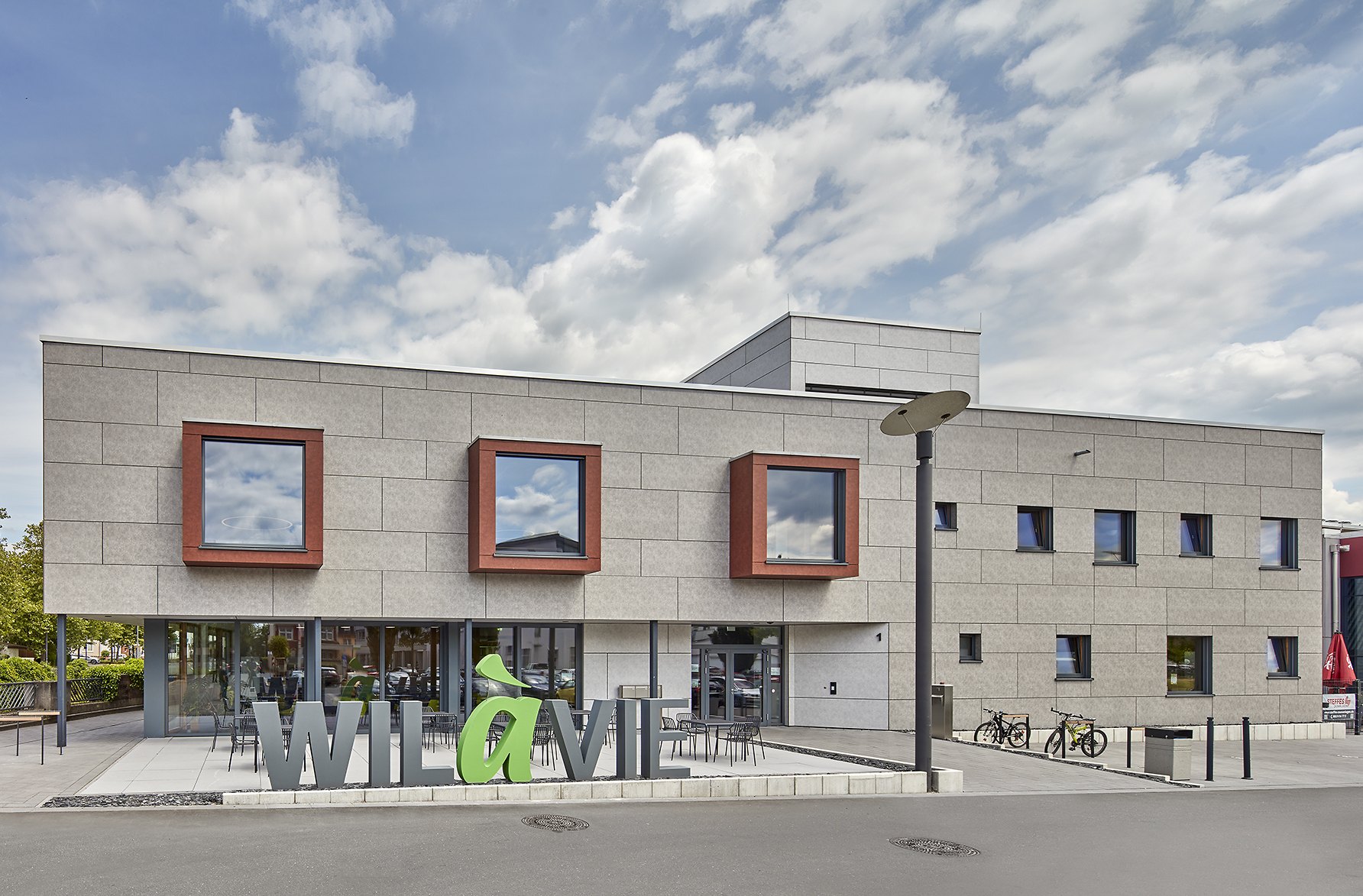 Neben einer Außenbestuhlung auf der Terrasse, die zukünftig im Rahmen der Angebote zum Sitzen und Verweilen einlädt, wurde davor als besonderes Highlight der Schriftzug "WILàvie" in 1,25 Meter hohen 3D-Buchstaben installiert. Diese Buchstaben -Installation als moderne Form der Hausbeschriftung, die sich optisch in das puristische Äußere des Gebäudes ideal einfügt, wurde von der Wittlicher Werbeagentur Eiring geplant und umgesetzt. Die Front- und Rückseiten der Styropor 3D-Buchstaben sind zusätzlich verstärkt und allseitig mit Polyurethan heißbeschichtet. Die Oberflächen ist rau, ähnlich einem feinen Putz.