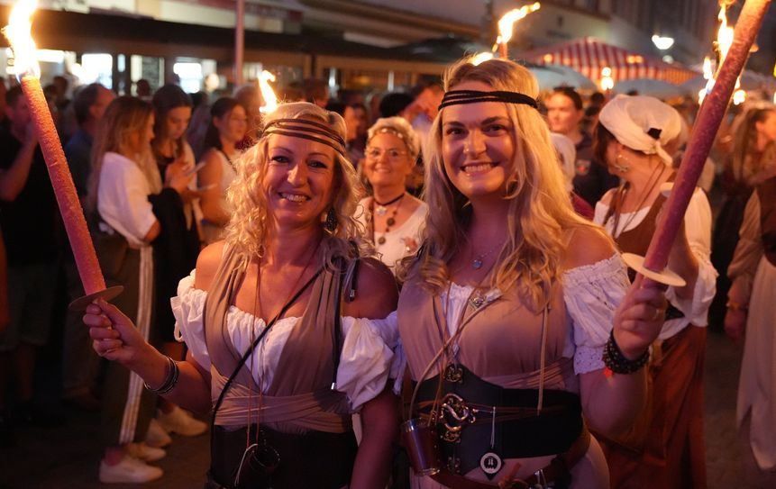 Nur wenige Stunden später verwandelte sich die Innenstadt in eine Bühne für eines der markantesten Elemente der Kirmes: das „Säubrennen“. Im Schein unzähliger Fackeln zogen Ritter, Fanfarenbläser und Bürger vom Türmchen durch die Straßen bis in den Stadtpark. Dort wurde die historische Legende um den Ursprung des Festes aufgeführt: Eine hungernde Sau fraß in der Belagerungsnacht von 1397 die als Riegel eingesetzte Rübe aus dem Stadttor – und ermöglichte so dem Feind den Einmarsch. Aus Zorn über den Verrat trieben die Wittlicher anschließend alle Schweine der Stadt zusammen und verbrannten sie.