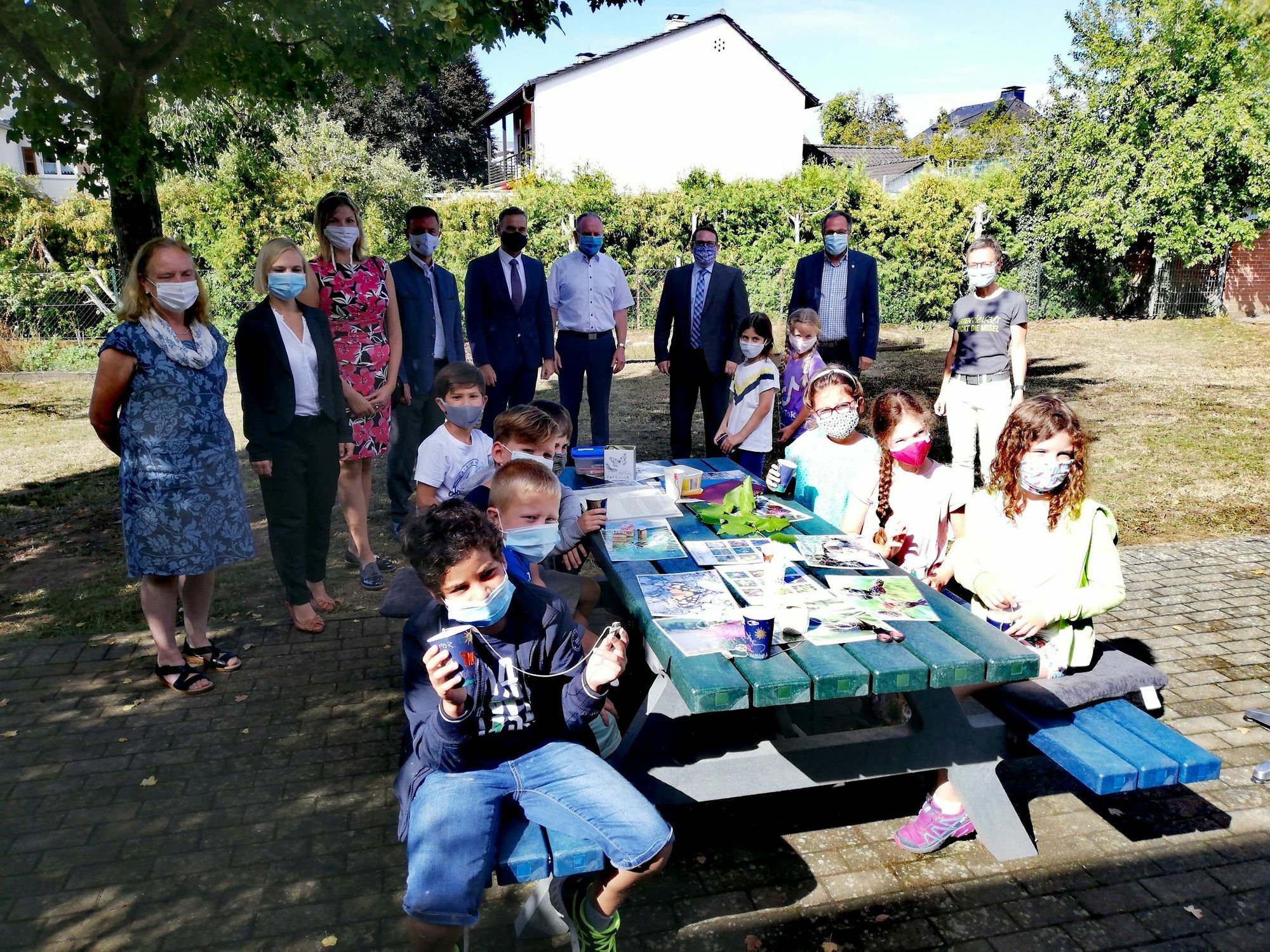 Parallel zu den Ansprachen sammelten Schülerinnen und Schüler der Klasse 3c im direkt anschließenden Garten der Mensa bereits erste praktische Erfahrungen mit der Broschüre und bastelten einen Fangbecher mit Schiefersteinen aus dem Weinberg. Die Gäste konnten sich von den begeisterten Schülerinnen und Schüler aus ihrer ersten Weinberg-Schulstunde vor Ort überzeugen und sich bei Traubenmuffins, Rosinenplätzchen, Traubensaft und Brot und Kräuterquark austauschen.