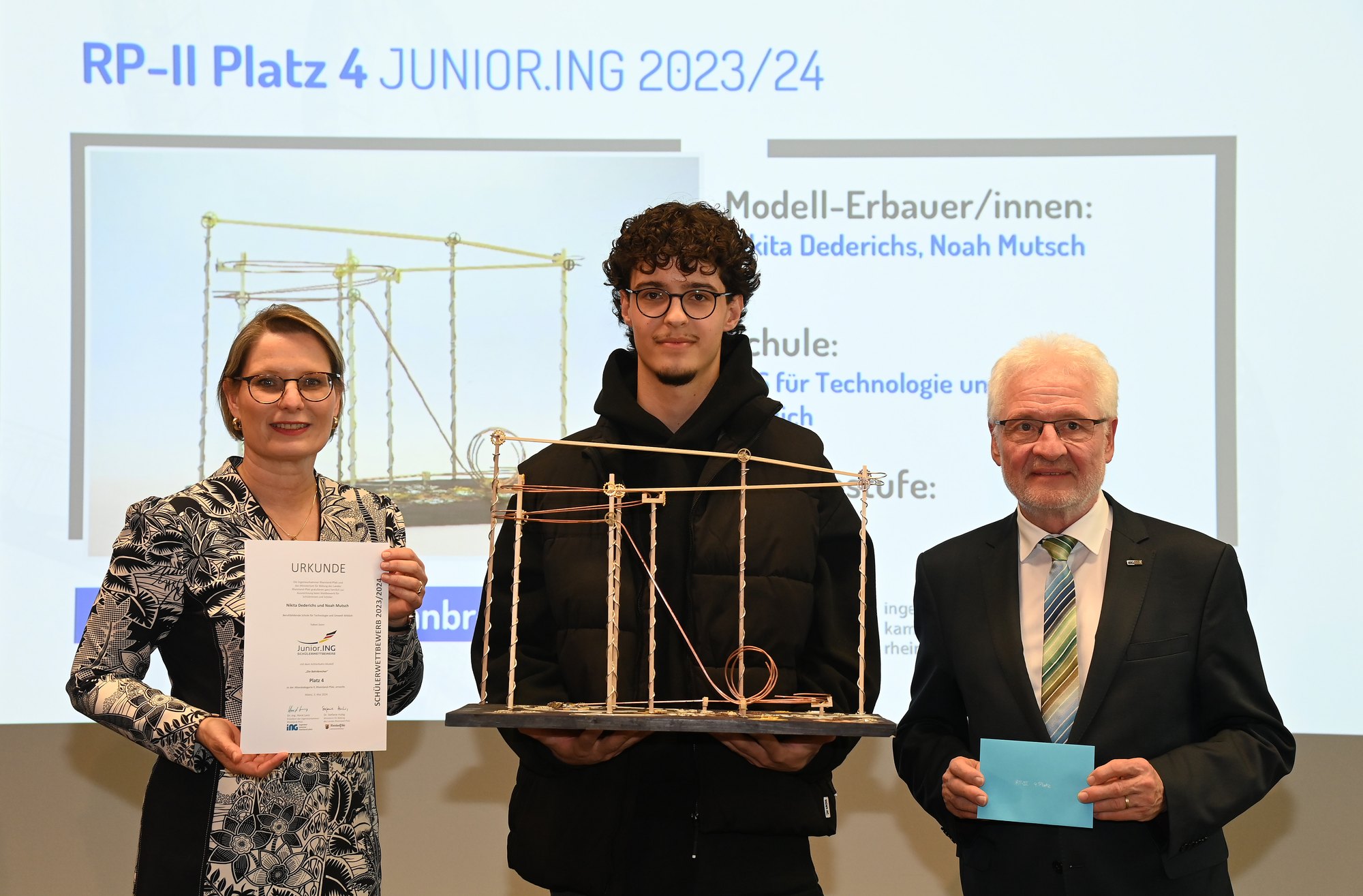 Fünf Schülerteams der Berufsbildende Schule für Technologie und Umwelt in Wittlich haben sich mit ihren ideenreichen Achterbahnen die vierten Plätze beim Landeswettbewerb "Junior.ING" der Ingenieurkammer Rheinland-Pfalz gesichert. Jule Bermes, Basira Hassanzada und Maja Schiffering überzeugten die Jury mit ihrem Modell "abandoned Lightning” genauso wie ihre Mitschülerinnen Kormelia Majcher und Natascha Speth mit “Hensel und Gretel – mal anders”. Ebenfalls ausgezeichnet wurden Jonte Freyberg und Nils Reuter mit dem Modell “? Fall in Love ?”, sowie Viola Belski und Niklas Simon mir “˜ Unterwasserwelt ˜” und Nikita Dederichs und Noah Mutsch mit “Die Bahnbrecher”.
