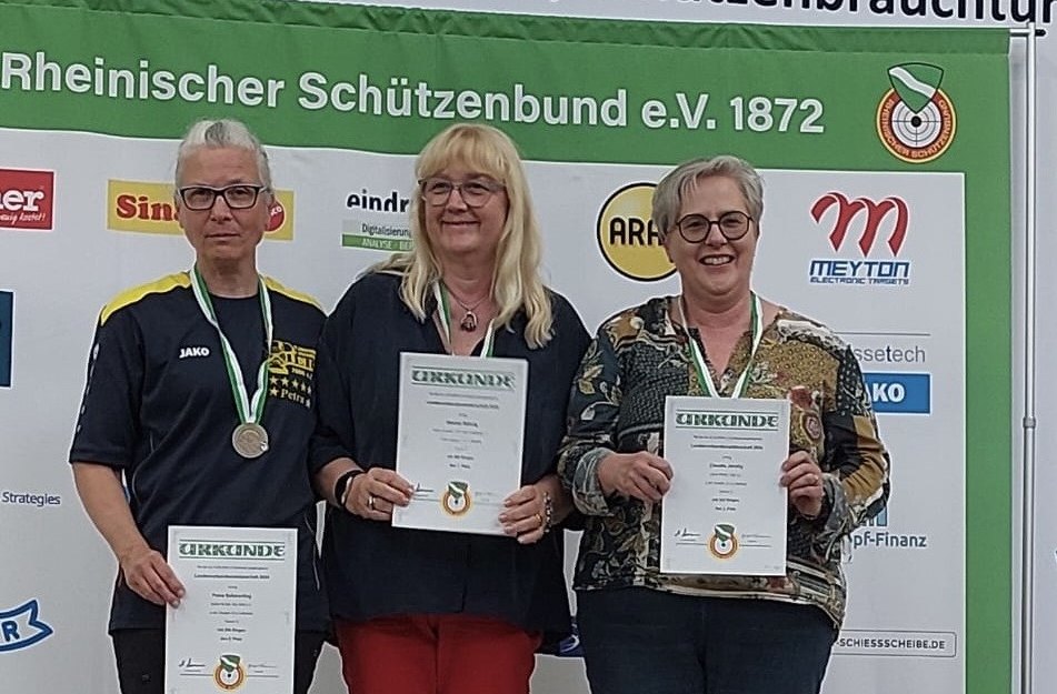 Foto1: Claudia Jacoby (rechts) bei der Siegerehrung des RSB in Dortmund. Links Petra Schmerling, die Zweitplazierte aus Zeltingen (Foto: RSB). Foto2: Niklas Mosbach (Mitte) am Beginn seines Wettkampfes. Er hat seinen ersten Wertungsschuss abgegeben, eine 10,4. (Foto: Mosbach). UJ 14.05.24