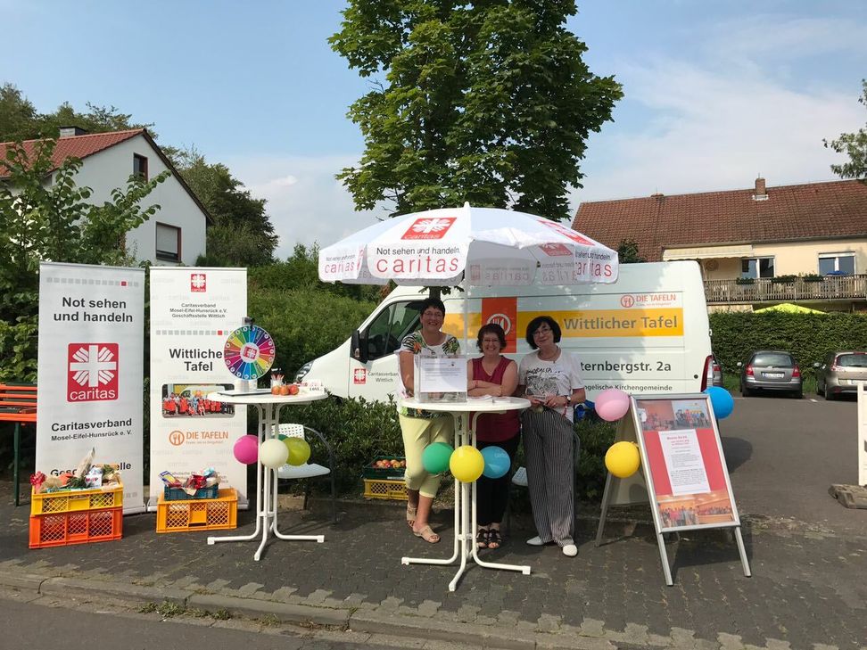 Die Wittlicher Tafel feiert in diesem Jahr ihr zehnjähriges Bestehen. Im Fokus des Jubiläumsjahres steht die Arbeit der rund 100 ehrenamtlichen Mitarbeiterinnen und Mitarbeiter, die Woche für Woche den Tafelbetrieb organisieren. Um einen Eindruck davon zu bekommen, was die Ehrenamtlichen jede Woche alleine körperlich leisten, hielten die Mitarbeiterinnen am Infostand beim ökumenischen Gemeindefest zwei Lebensmittelkörbe bereit, deren Gewicht geschätzt werden konnte: Einen großen Korb für Erwachsene und einen kleinen, leichteren Korb für Kinder. Die Beteiligung am Schätzspiel war groß. Je nachdem, wie nah man am korrekten Gewicht lag, durfte einmal, zweimal oder sogar dreimal am Glücksrad gedreht werden. Auch die Trostpreise in Form von mitgebrachten Tafeläpfeln waren bei den hohen Temperaturen gerne gesehen. Die spannende Frage nach dem exakten Gewicht wird an dieser Stelle gelüftet: der große Korb wog ganze 10,6 Kilogramm und der kleine 3 Kilogramm. Dass die Wittlicher Tafel bei dem besonderen Kirchentag vor Ort war, ist kein Zufall. Die Pfarreiengemeinschaft Wittlich und die evangelische Kirchengemeinde Wittlich sind als Kooperationspartner der Tafel von Anfang an in die Arbeit involviert und unterstützen das Projekt, insbesondere auf finanzieller Ebene. So wurde auch im Auftakt-Gottesdienst zum Gemeindefest eine Kollekte zugunsten der Tafel durchgeführt. Der Dank gilt allen Spendern und Unterstützern. Weitere Infos zur Arbeit der Wittlicher Tafel bei Anja Adam, Tel. 06571 / 95 63 38 19, oder per Email an adam.anja@caritas-wittlich.de. Foto: FF