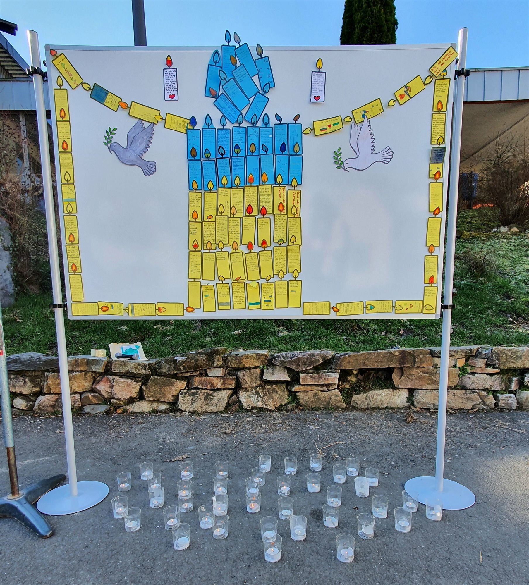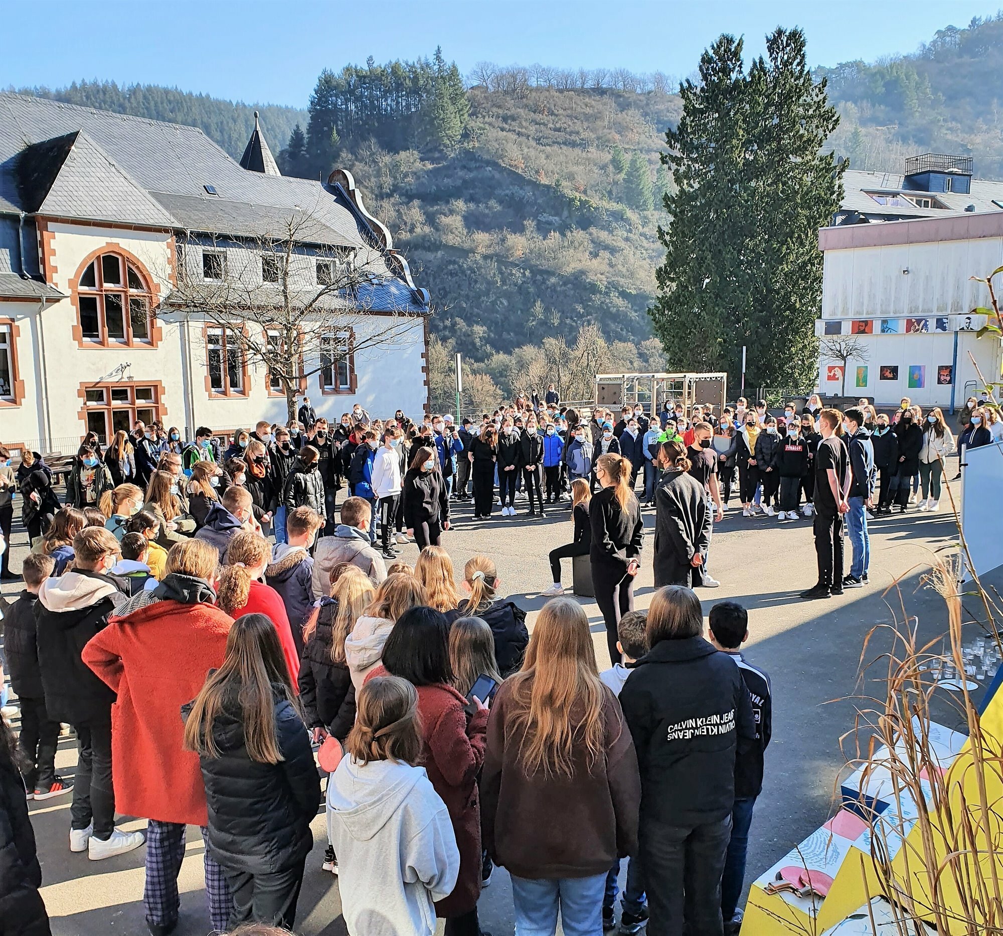 Die SoR-AG, die SV, verschiedene Fachbereiche sowie Klassen und Kurse organisierten eine Schweigeminute mit einer kurzen Erklärung, einer Theater-Performance und einem gemeinsamen Singen auf dem Schulhof. Zusätzlich wurden die gesammelten Wünsche, Ängste und Hoffnungen vieler Schülerinnen und Schüler auf kleine Papierkerzen geschrieben und von der Klasse 7a (unter der Leitung von Lea Löwen) zu einer großen Kerze zusammengefügt. Bei schönstem Sonnenschein und andächtiger Stimmung verlieh die Schulgemeinschaft so der Hoffnung Ausdruck, dass das Leid der ukrainischen und russischen Bevölkerung durch eine baldige Beendigung des Krieges aufhören möge.