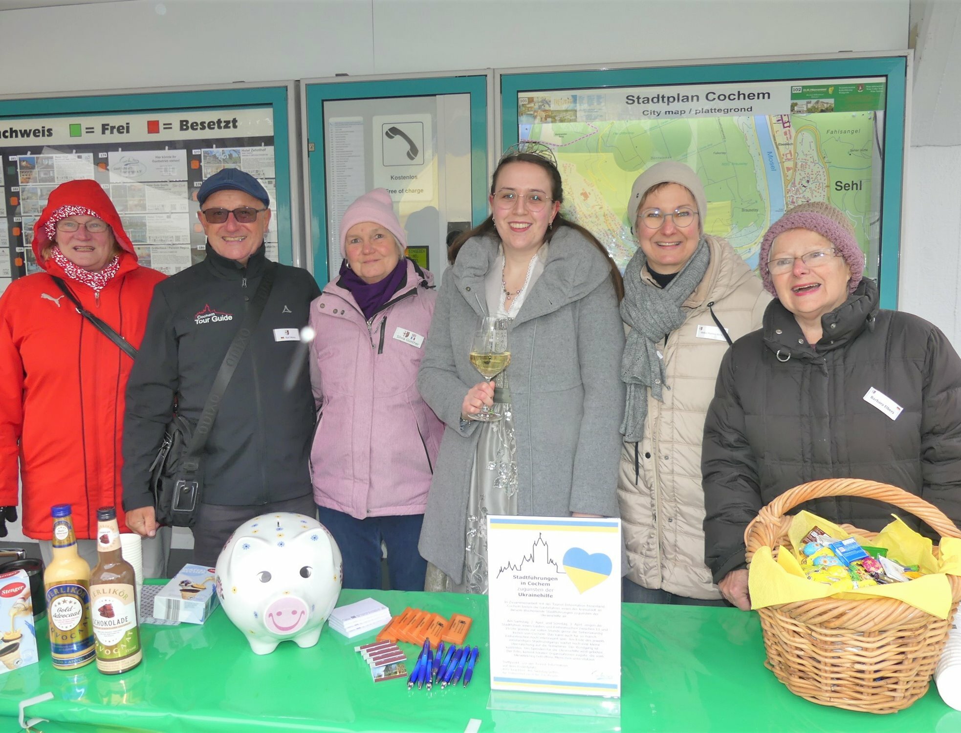 Mit Unterstützung der Tourist-Information Ferienland Cochem haben die Cochemer Gästeführer auf dem Ostermarkt Gratisführungen zugunsten der Ukrainehilfe angeboten. Wer wollte, konnte am Ende der Führungen eine Geldspende in ein extra dafür aufgestelltes Sparschwein geben. Insgesamt 1.000 Euro kamen so bei der Aktion zusammen, die die Cochemer Gästeführer dem Club Soroptimist Cochem zukommen lassen. Der Klub unterhält einen Kontakt zu einem Partnerklub in der Stadt Uzghorod in der Ukraine. Von den Geldspenden werden die Dinge gekauft, die die vom Krieg betroffenen Menschen vor Ort am dringendsten benötigen. In regelmäßigen Abständen finden vom Club Soroptimist Cochem organisierte Hilfstransporte an die ukrainische Grenze statt. Die von den Stadtführern gesammelten Spenden kommen also genau da an, wo sie ankommen sollen.