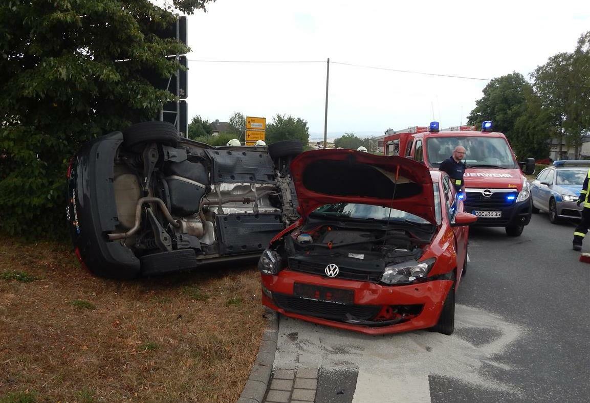An der Kreuzung L 109/K 26 übersah der junge Mann offensichtlich den vorfahrtsberechtigten Pkw der Frau, so dass es zum Zusammenstoß der beiden Fahrzeuge im Kreuzungsbereich kam. Durch die Wucht des Zusammenpralls kippte der Pkw des 24-Jährigen auf die Seite und blieb liegen. Er wurde bei dem Unfall schwer, die Fahrerin des anderen Autos und ihr Kind leicht verletzt.  Den entstandenen Sachschaden schätzt die Polizei auf rund 20.000,- Euro. Im Einsatz waren neben der Polizei Cochem und dem DRK auch Einsatzkräfte der Freiwillige Feuerwehr und der Straßenmeisterei Cochem.  Foto: Polizei