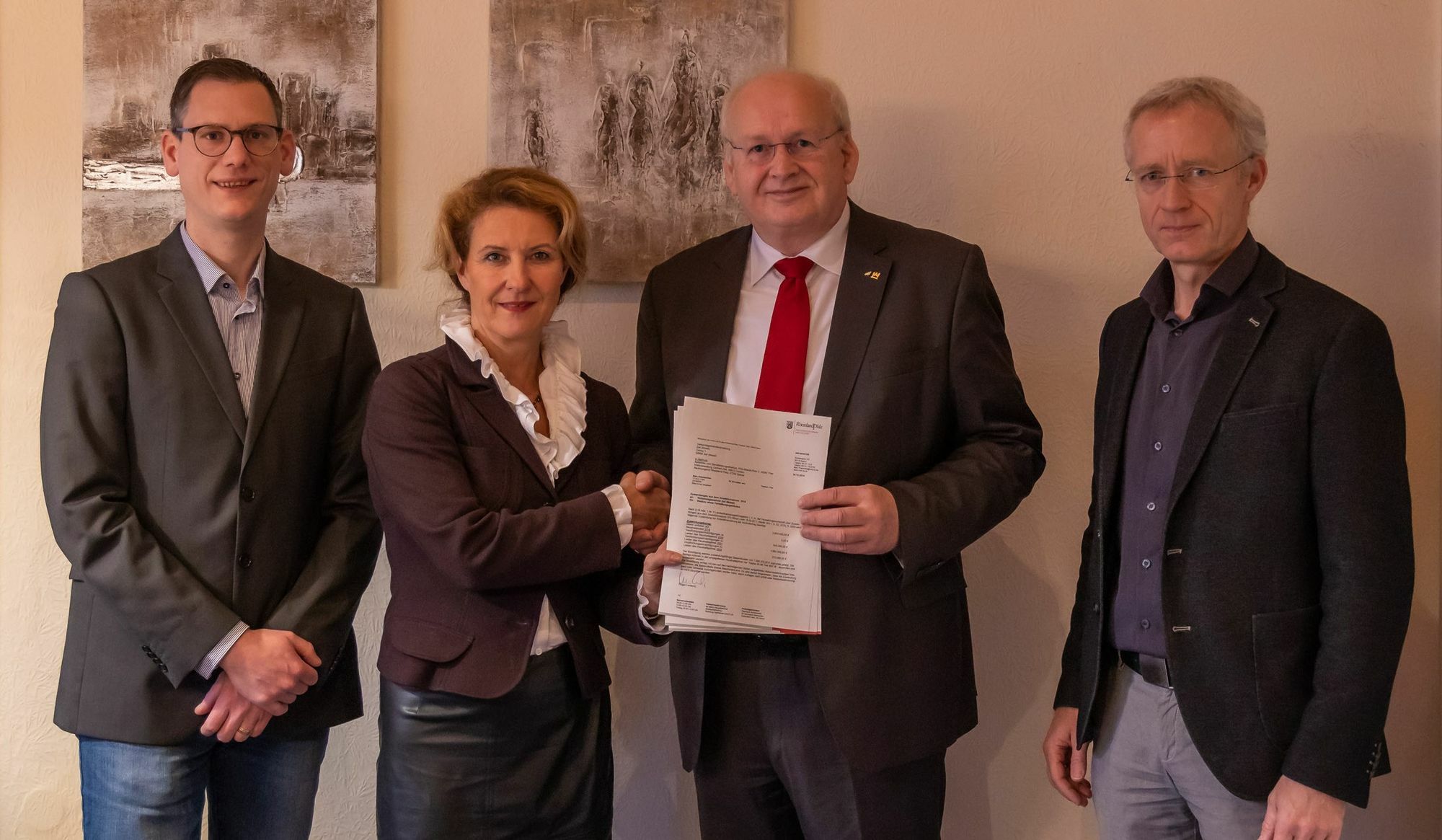 VG-Bürgermeister Karl Heinz Simon, der den Bewilligungsbescheid gemeinsam mit Büroleiter Andreas Schorn und dem Sachgebietsleiter der Bauverwaltung der Verbandsgemeinde, Martin Steinmetz, von Staatssekretärin Heike Raab entgegennahm, dankte der Landesregierung für die Unterstützung. Jetzt könne die Planungsphase in die Detailplanung übergehen und das Projekt anschließend starten. Auch die standortbedingten Mehrkosten aufgrund der Hochwassersituation oder der Bodenbeschaffenheit seien als förderfähig anerkannt worden. "Eine moderne Verwaltung benötigt auch eine moderne Infrastruktur", erklärte Staatssekretärin Heike Raab bei der Übergabe des Zuwendungsbescheids. "Dies ist in Zell seit langem nicht mehr gegeben. Es ist gut, wenn die Planungen, welche ich seit jetzt fast 20 Jahren, zuerst als Abgeordnete, später als Staatssekretärin begleite, nunmehr in die Umsetzung gehen können", betonte Raab. Das bestehende Verwaltungsgebäude entspreche insbesondere mit Blick auf den Gebäudezustand, den Platzmangel, den Anforderungen an digitale Arbeitsplätze und die fehlende Barrierefreiheit seit langem nicht mehr den Anforderungen an einen zeitgemäßen Verwaltungsbetrieb. Die beiden geplanten Baukörper werden Platz für Büro- und Technikräume bieten. Die Verbandsgemeinde Zell hat etwa 170 Mitarbeiterinnen und Mitarbeiter, von denen etwa 70 im Verwaltungsgebäude beziehungsweise derzeit auch im benachbarten Sparkassengebäude arbeiten. Die Barrierefreiheit im Neubau wird durch einen ebenerdigen Zugang sowie einen Aufzug von der Parkanlage in das Erdgeschoss und die beiden Obergeschosse sichergestellt. Parkplätze in einer Tiefgarage werden die Erreichbarkeit erhöhen. Die Verbandsgemeinde plant den Energiebedarf des Gebäudes mittels Erdwärmetechnik in Kombination mit einer Photovoltaikanlage zu decken. Die Gesamtkosten des Neubaus des Verwaltungsgebäudes betragen rund 11,6 Millionen Euro. Die Landesmittel sollen nach Baufortschriftt in den Jahren 2020 bis 2022 ausgezahlt werden. Foto: VG Zell www.zell-mosel.de